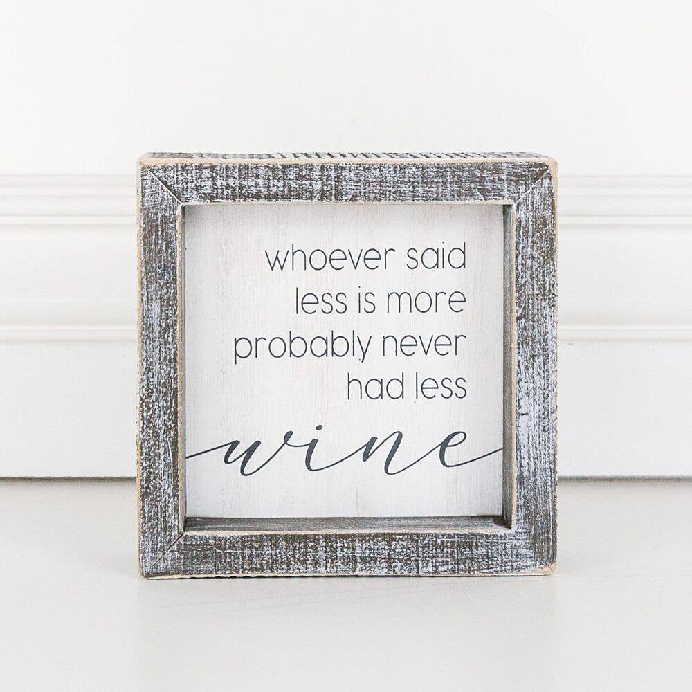 - This wooden framed sign displays a message saying, "Whoever Said Less Is More Probably Never Had Less Wine"