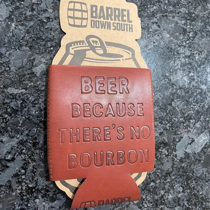 Our Beer Because There's No Bourbon Can Cooler is made of faux leather and lined with neoprene to keep your favorite beverage ice cold.