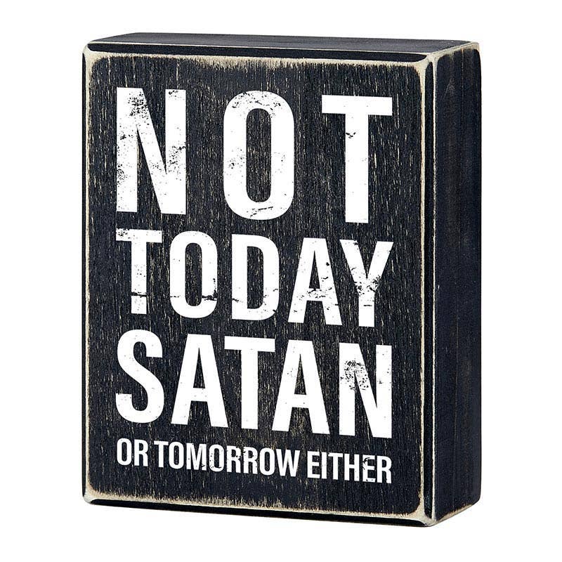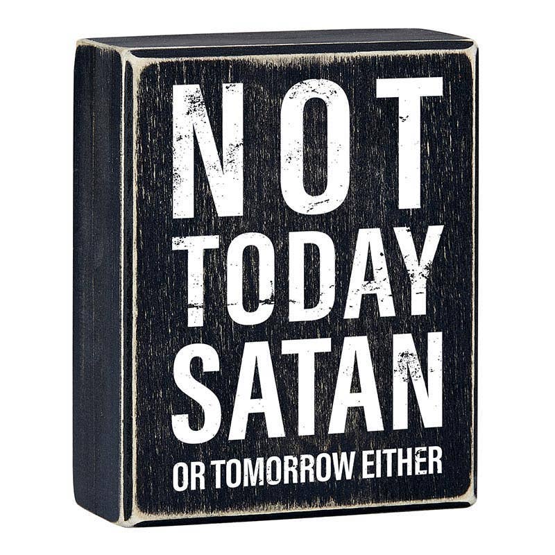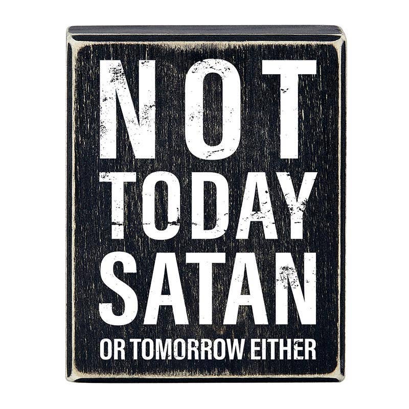 - Measuring 4 x 5", this rustic wooden sign features the message 'Not today Satan, or tomorrow either'.