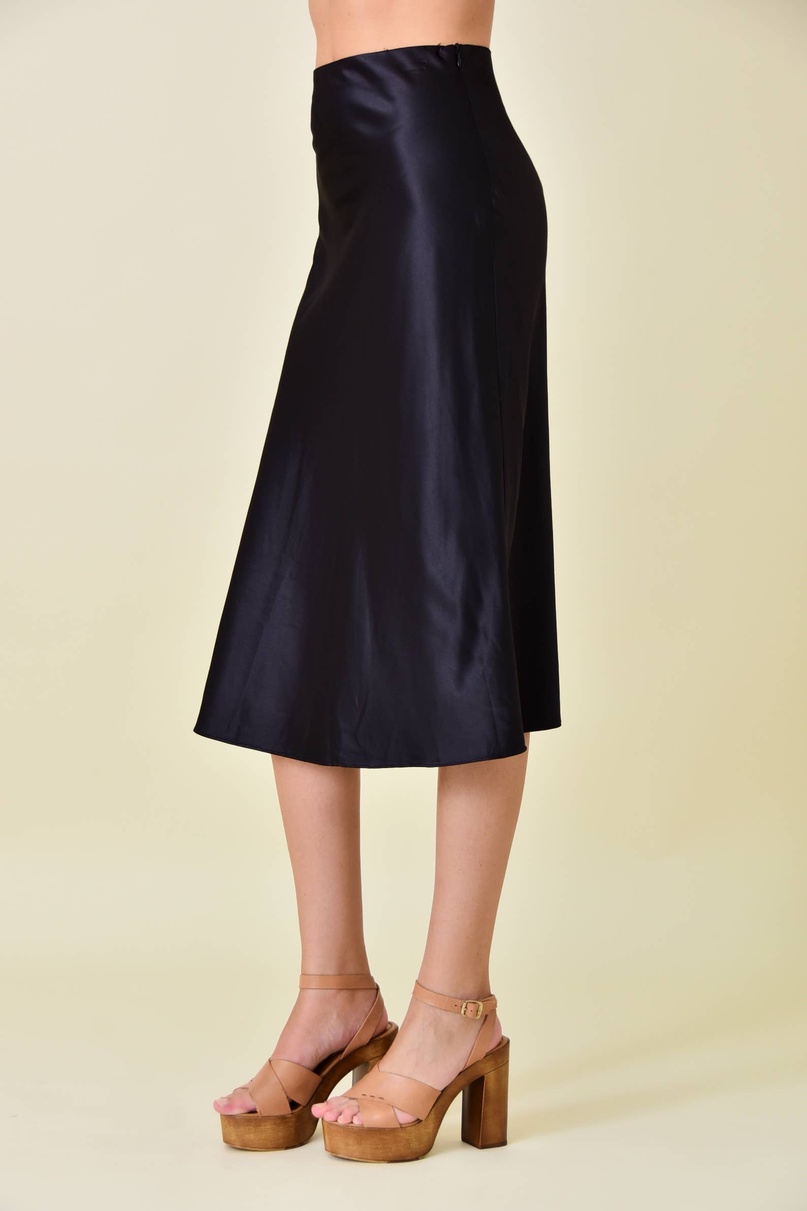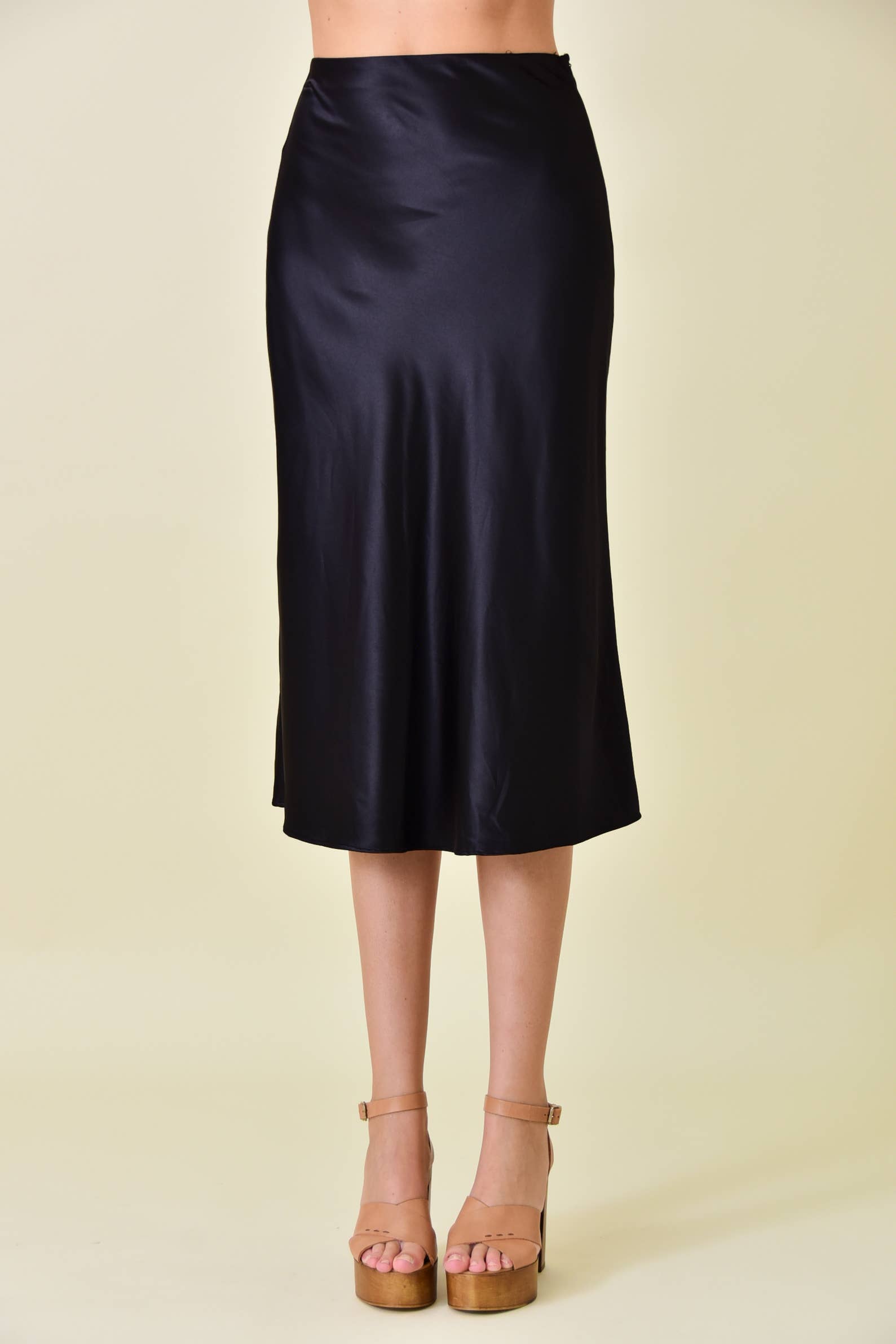 - This skirt is an elegant and classic piece that falls just below the knee. It is made of a smooth, lustrous satin material and has a flattering pencil shape that accentuates the curves of the body.