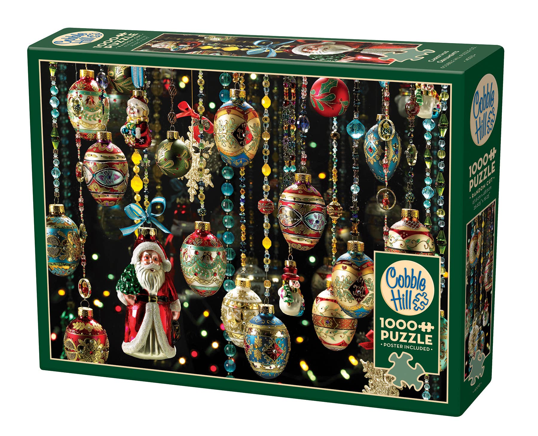 Christmas Ornaments hang from beautifully beaded strands of wire to make for a glowing decoration to bring light and life to your home. Enjoy this truly original photo 1000-piece Christmas puzzle that was uniquely arranged in Victoria, BC.© Cobble Hill Puzzle Co