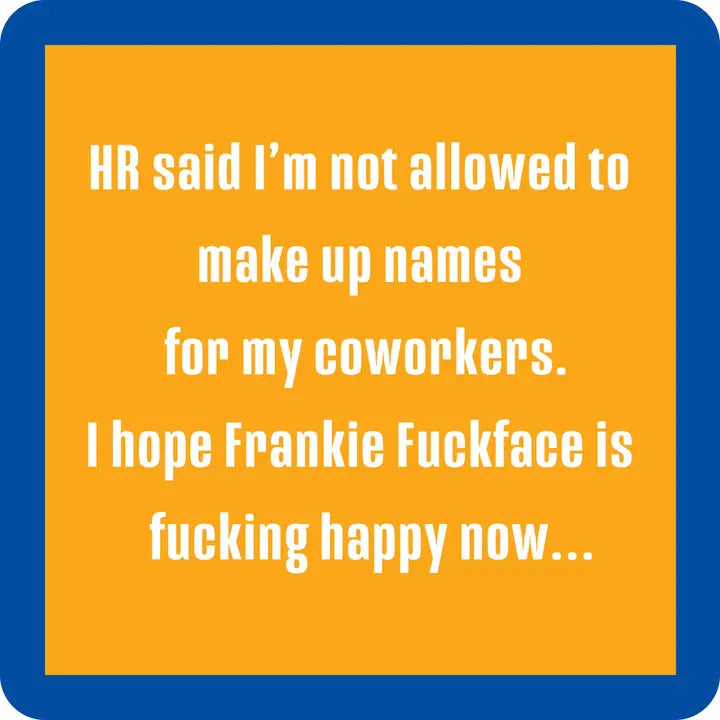 - "HR said I'm not allowed to make up names for my coworkers. I hope Frankie Fuckface is fucking happy now..." coaster