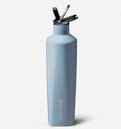 - 25 oz insulated water bottle with leakprook, sip-through straw lid and durable carrying handle.