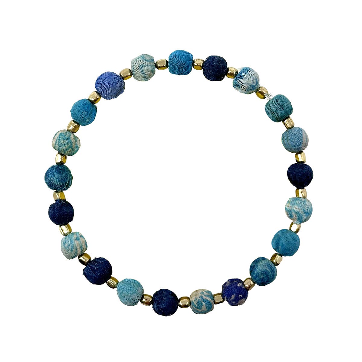 - The Dotted Kantha Bracelet has been reimagined in brilliant shades of blue! Small, upcycled Kantha textile beads have been hand-sorted in different hues of blue, and interspersed with golden seed beads. The beaded bracelet is perfect to wear on its own or layered with other styles.