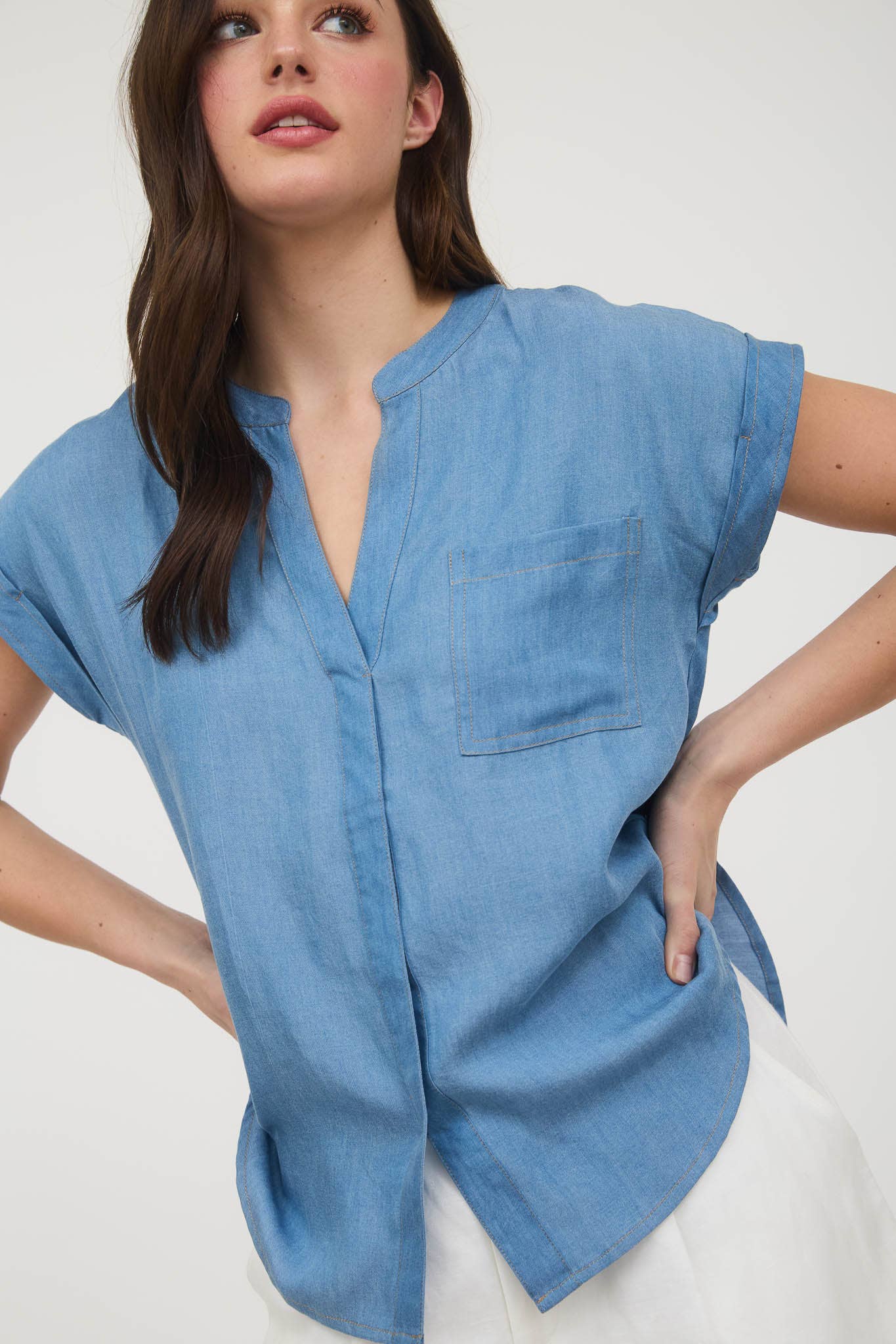 Chambray Front Split Back Button Cuff Sleeve Shirt