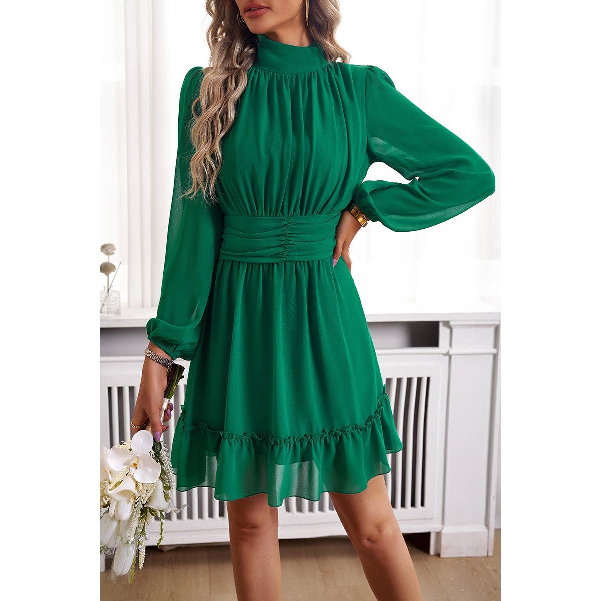 Green Mock Neck Self Belt Ruched Lined Ruffle Dress