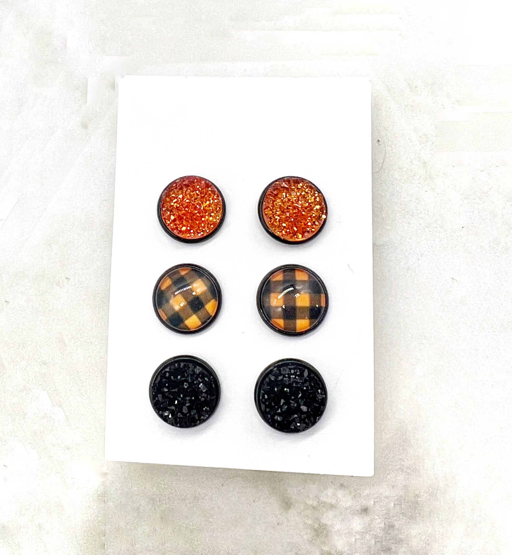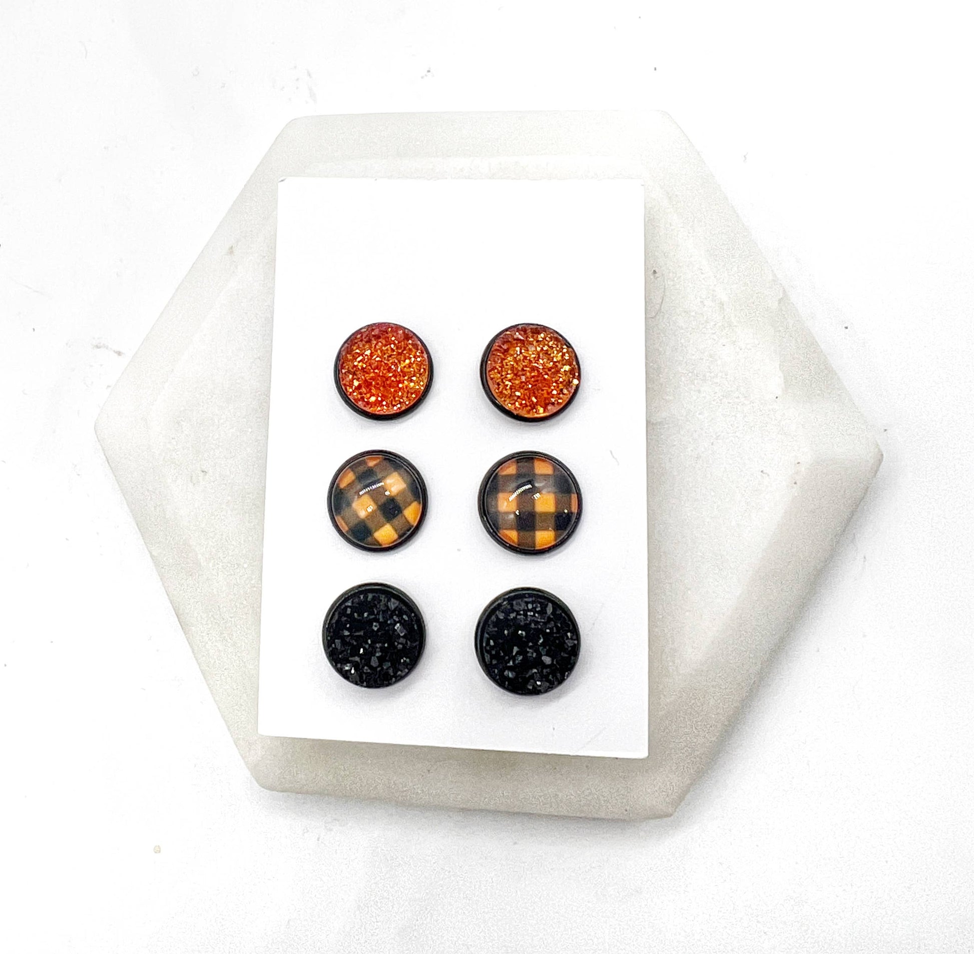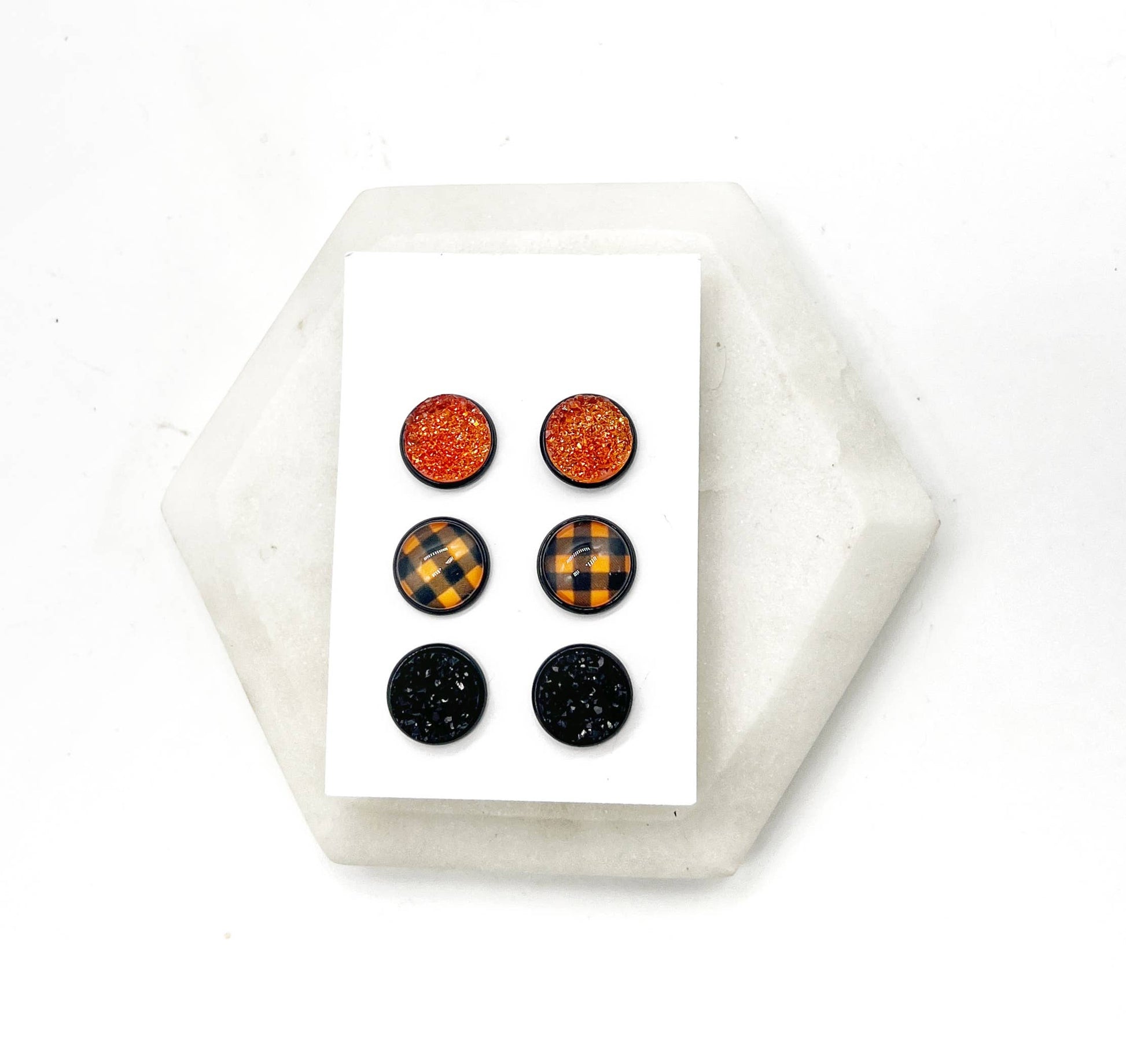 Fall Orange Buffalo Plaid Druzy Stud Trio