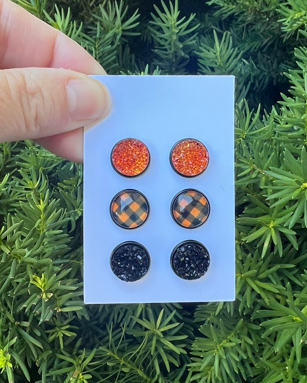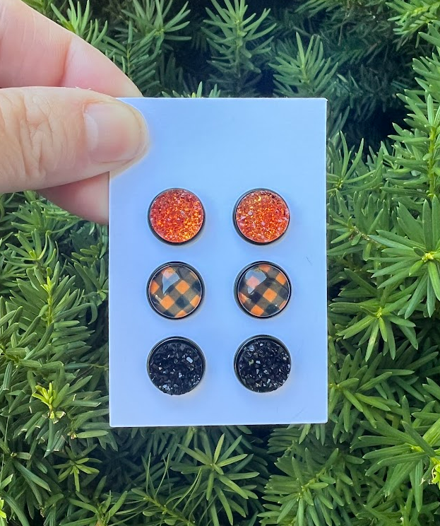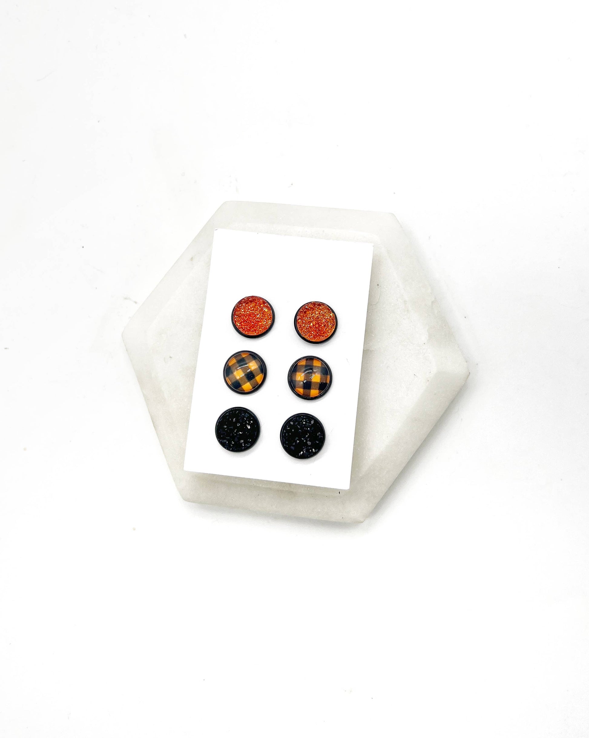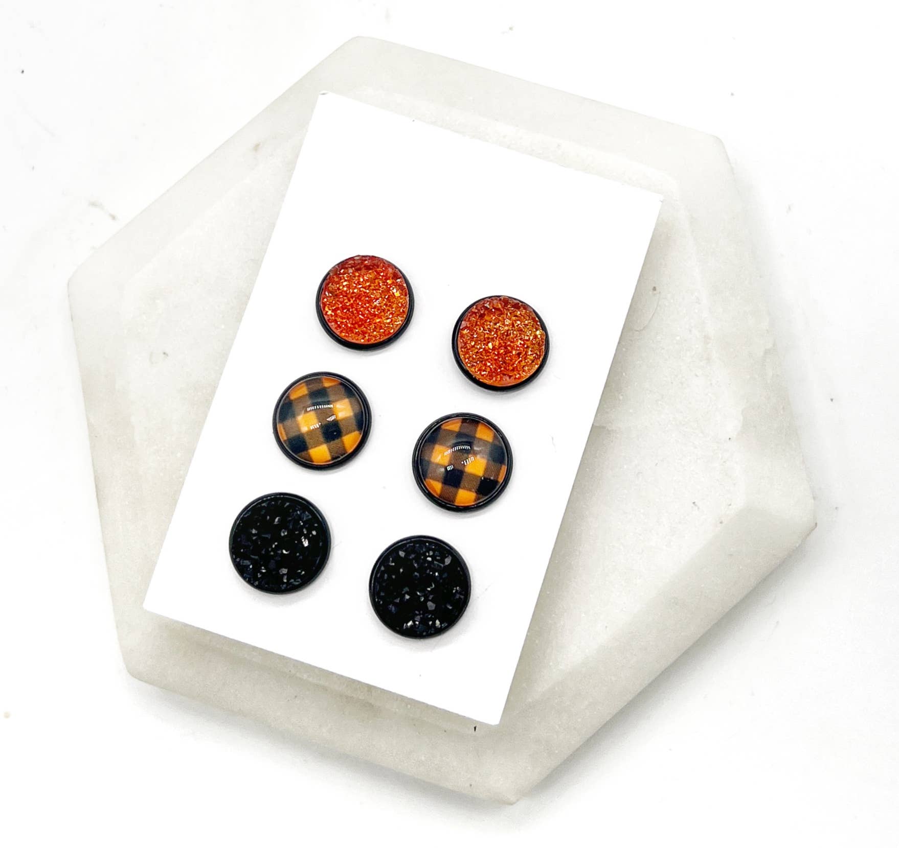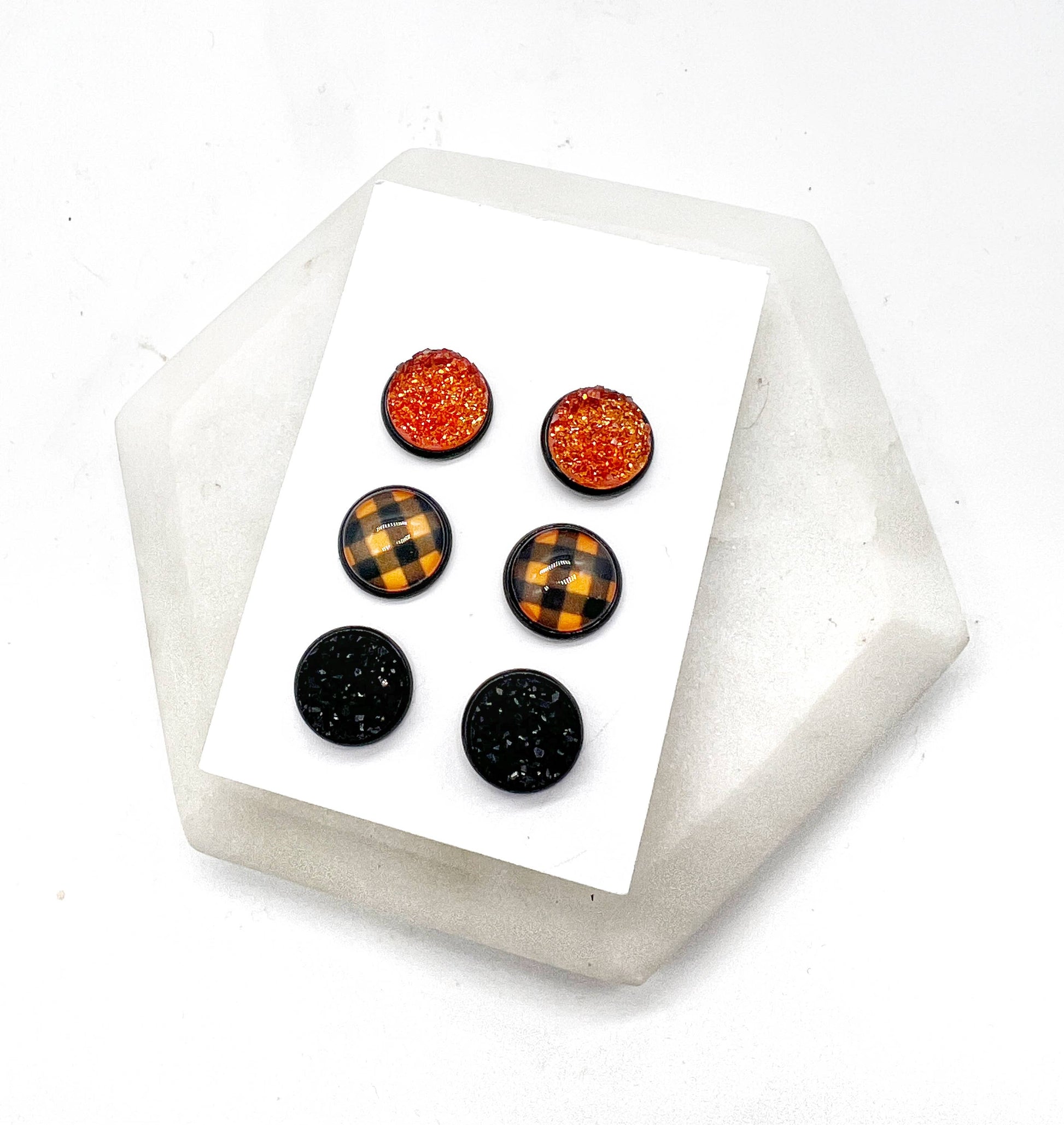 Fall Orange Buffalo Plaid Druzy Stud Trio