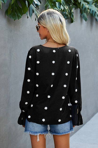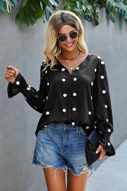 Black Polka Dot V Neck Button Up Blouse