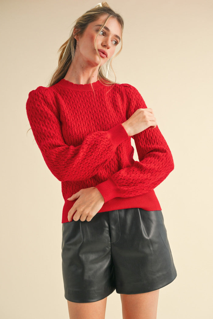 Get a fresh look for Fall starting with this puff sleeve pointelle! Sweater knit, with pointelle throughout, shapes this essential sweater that has a scalloped mock neck framed by long puff sleeves. Contrasting ribbed knit accents the neckline cuffs, and hem.