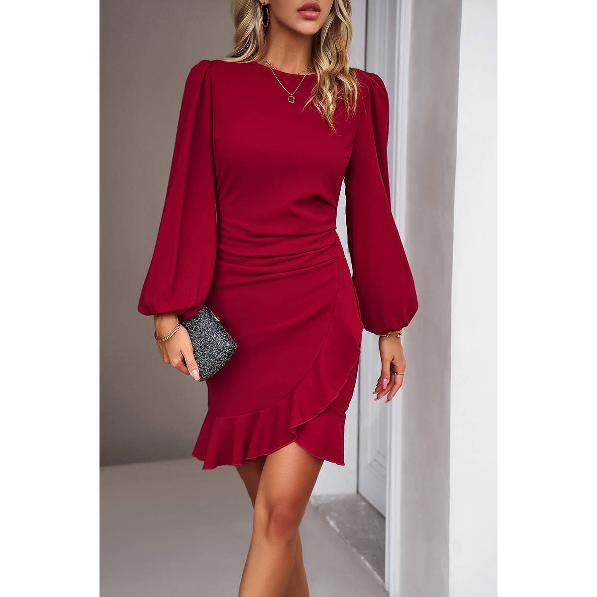- Features: Solid wrap design Ruched hem Ruffle fit Puff sleeves