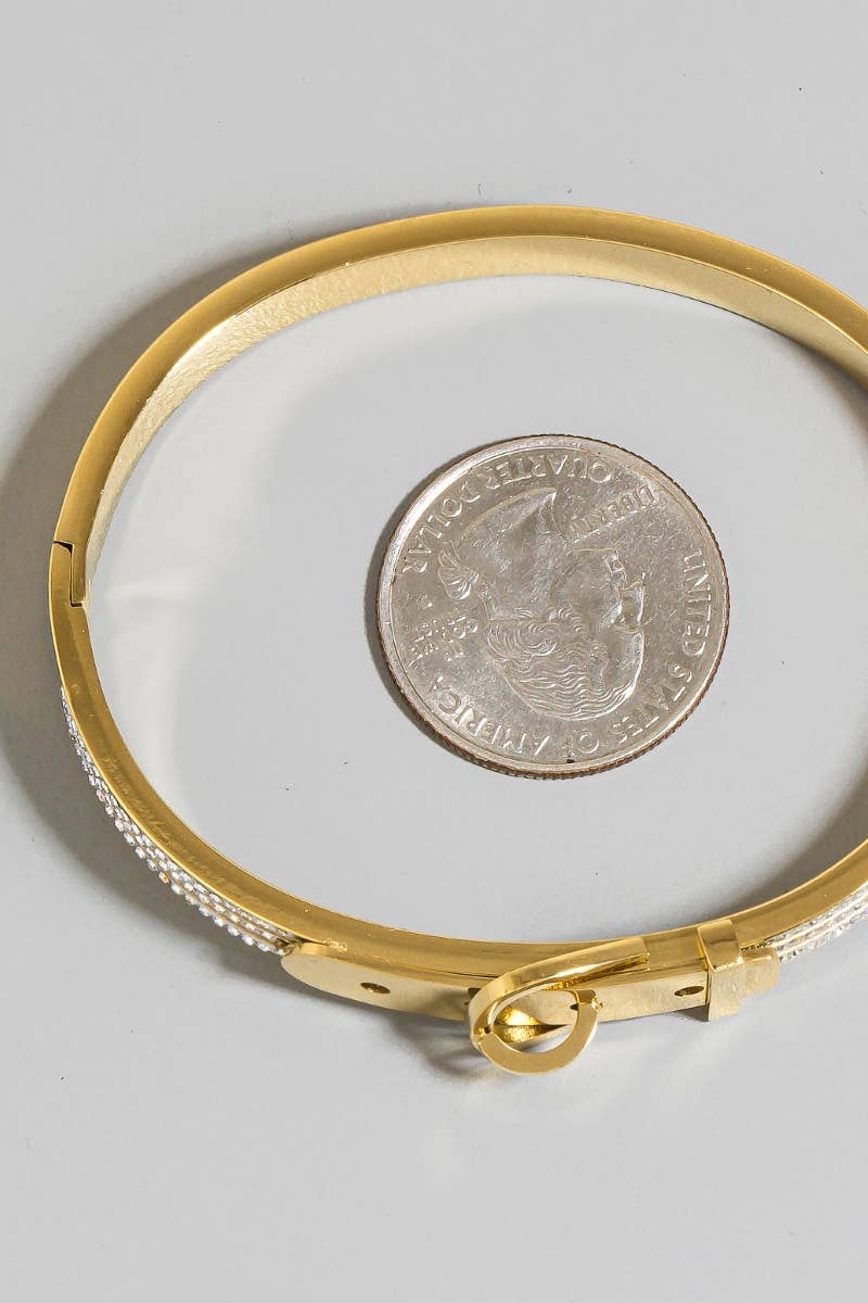 This bangle bracelet introduces a unique stainless steel pave belt style hinge style. Immerse yourself in the world of understated glamour as this bangle bracelet effortlessly exudes timeless appeal.