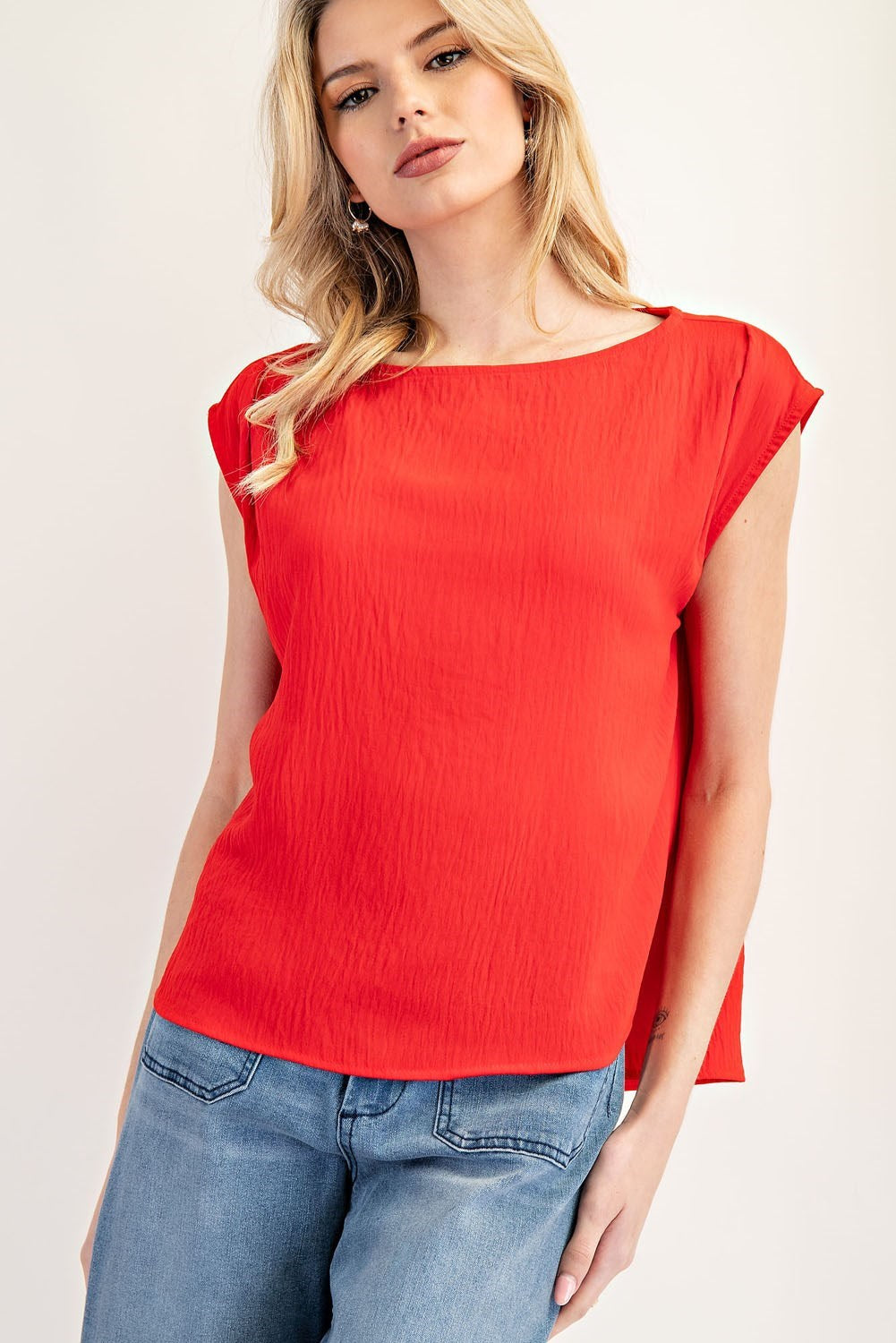 This sleeveless top showcases a breezy, crinkled texture, a relaxed boxy silhouette, subtle cap sleeves, and a wide round neckline, complemented by a high-low hem with small side slits for effortless movement and a contemporary, casual-chic appeal.
