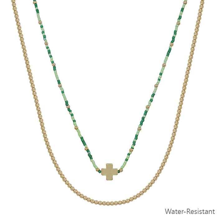 The Water Resistant Green Seed Bead with Gold Cross Necklace is a trendy and stylish piece. This pendant charm necklace, with its vibrant green seed beads and gold cross, offers a perfect blend of fashion and spirituality. Adjustable from 16" to 18", it is designed to suit various necklines and outfits. Thanks to its water-resistant properties, you can wear it worry-free, regardless of the weather or occasion.