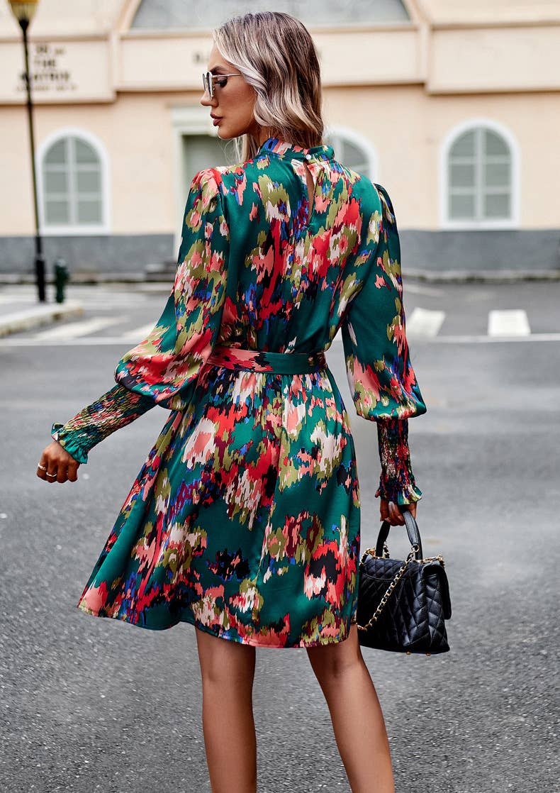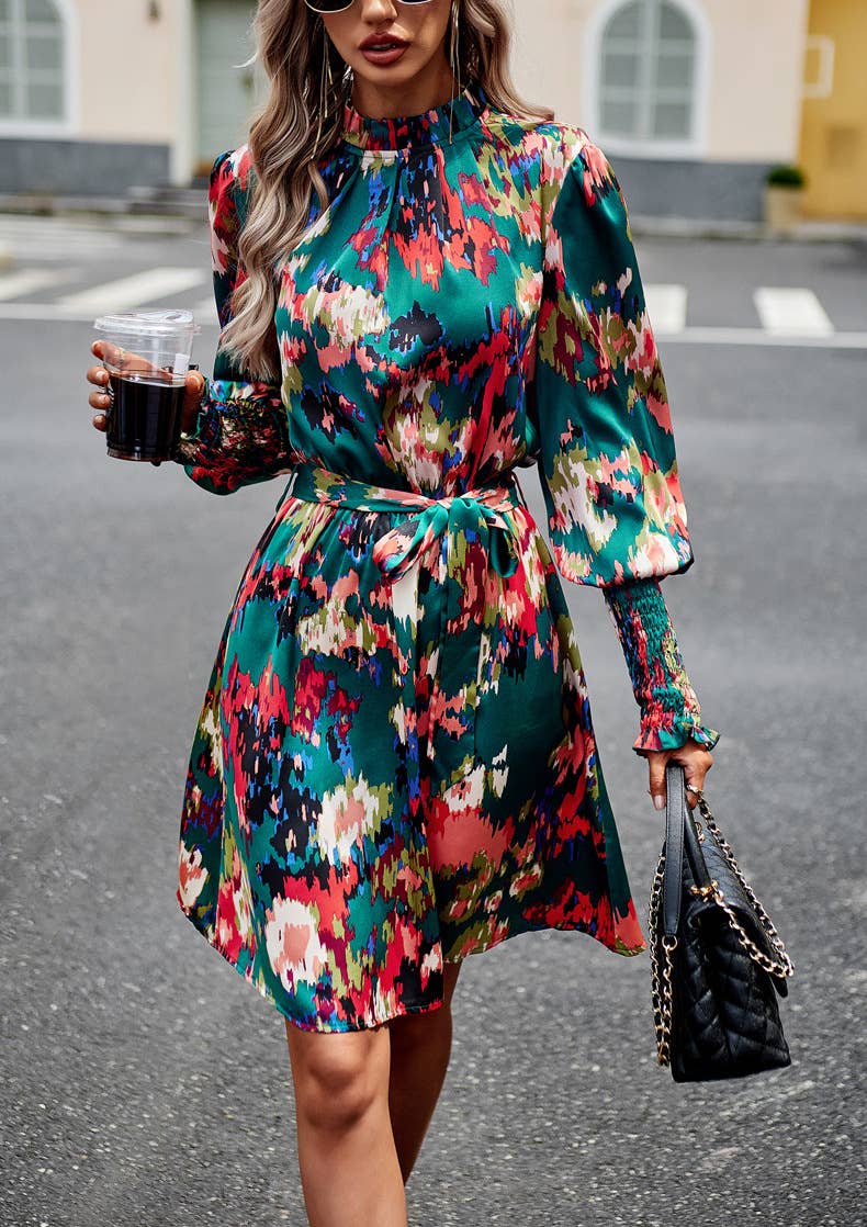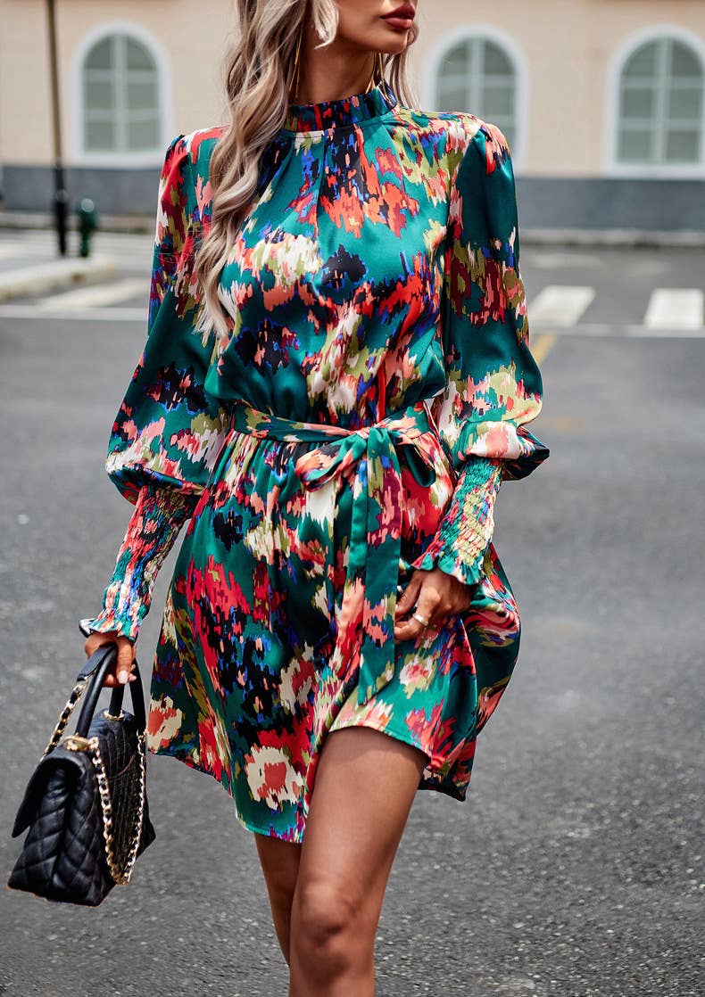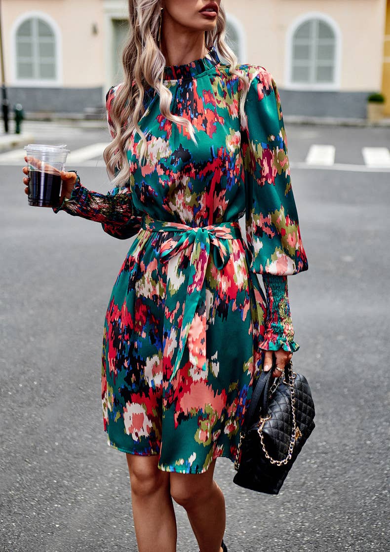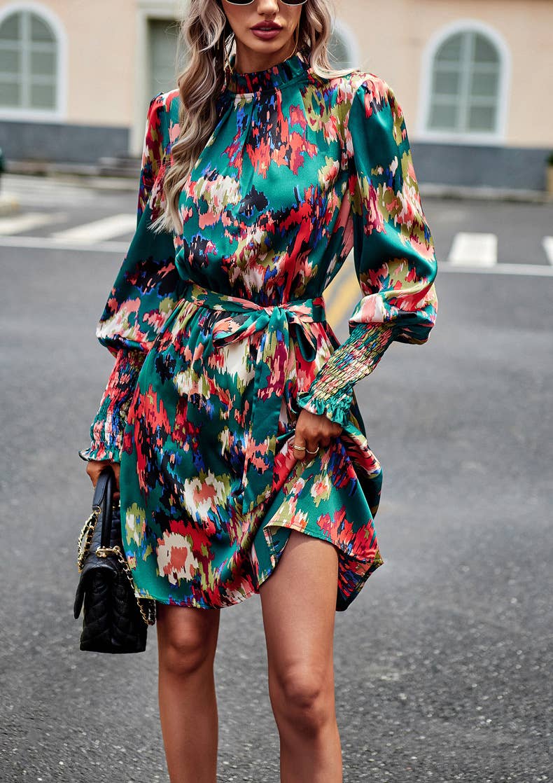 - Floral print, stand collar, shirred mock neck, tie neck, long sleeve, high elastic waist, A-line ruffle short dress