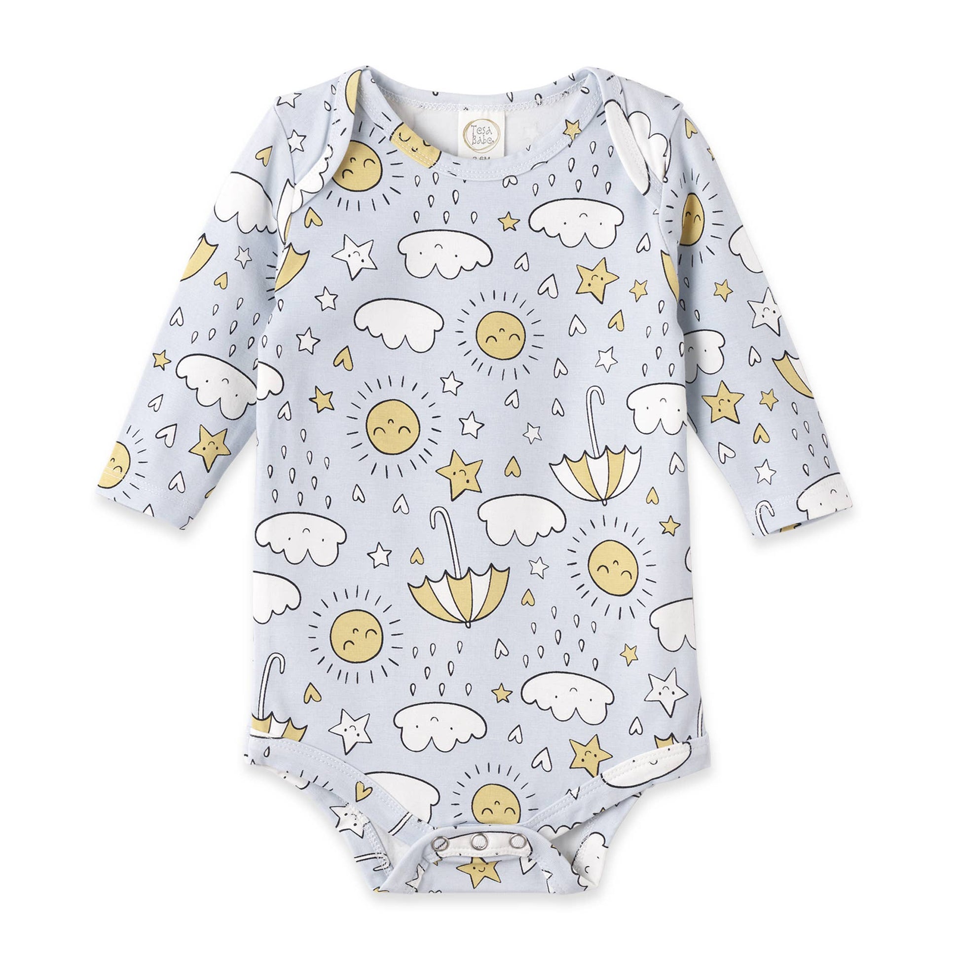 Pack of 2 long sleeve bodysuits with envelope neck and snaps at bottom for easy on and off. One has a playful rainy day print in soft blue and yellow and is made of bamboo/cotton/spandex blend jersey. The other is a yellow-striped bodysuit made of soft and stretchy 100% cotton. Machine wash warm. Tumble dry low. T