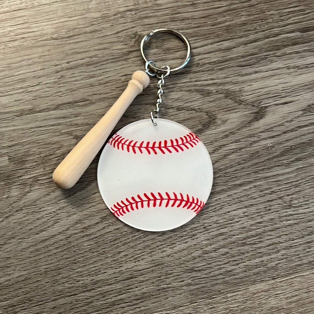 - Acrylic baseball and wood bat are paired together on this adorable keychain.
