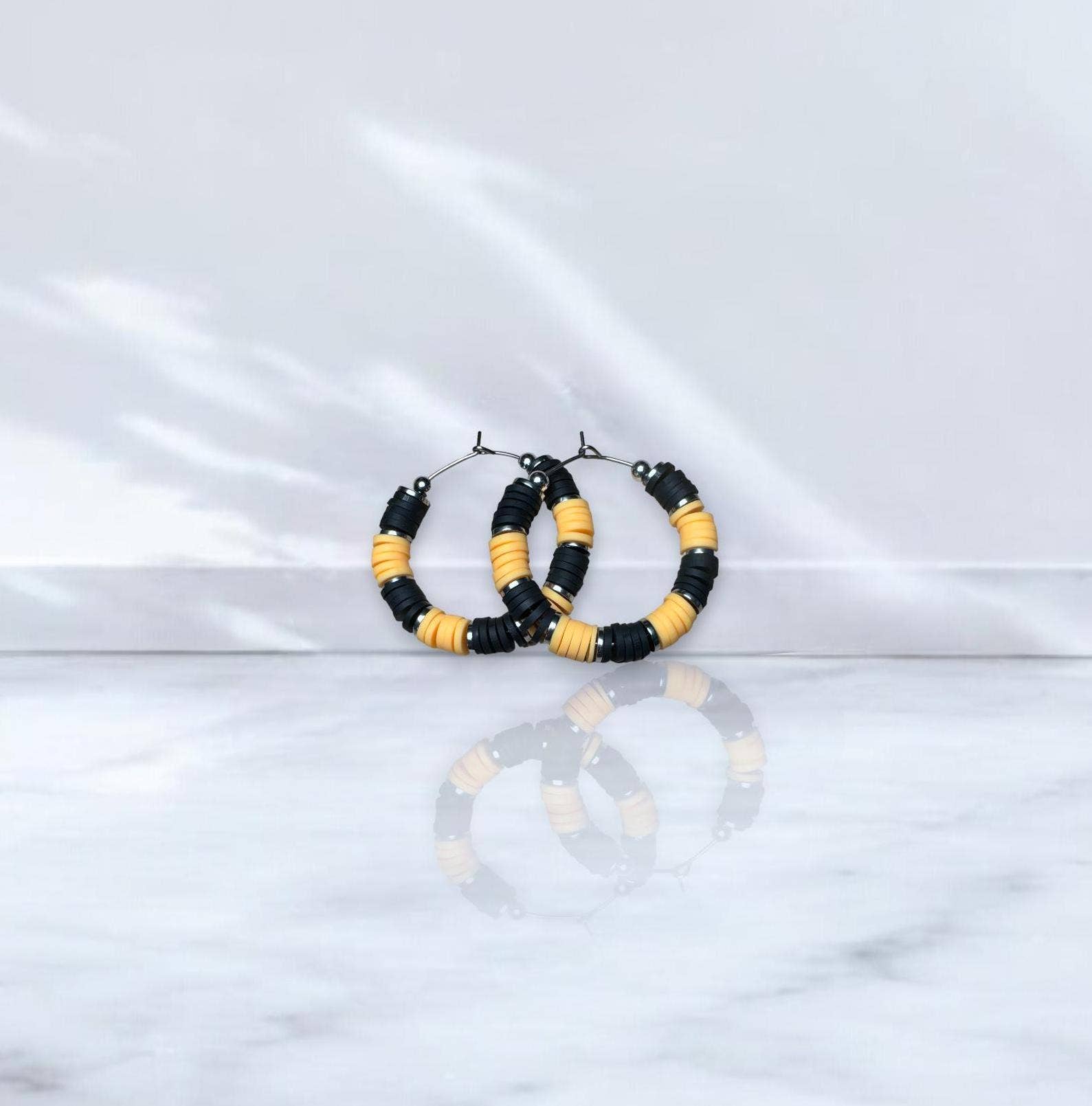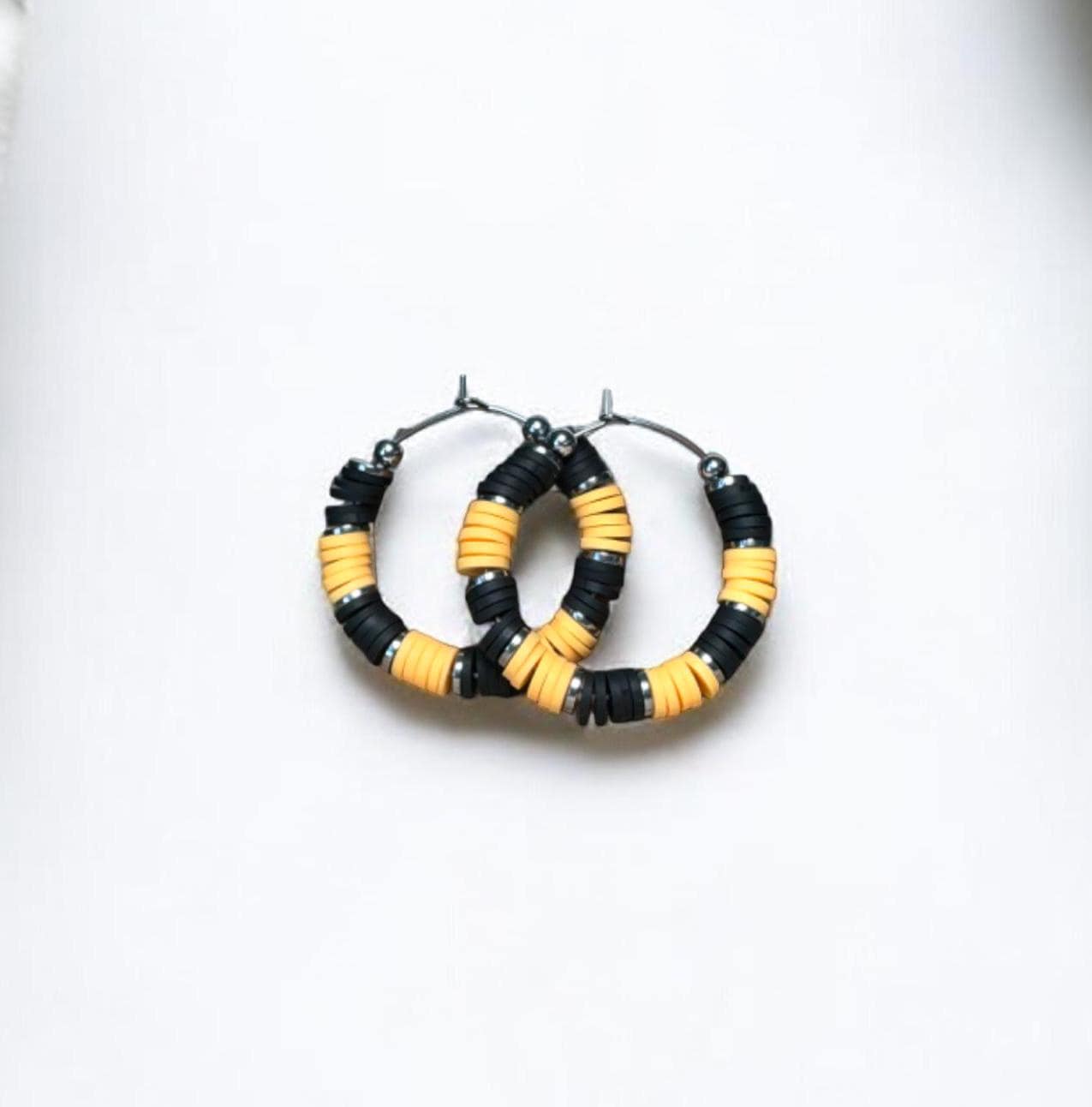 Black And Gold Game Day Hoop Earrings | Game Day Jewelry | Team Spirit | Game Day Earrings | Gift For Team Mom Show your team spirit and represent your game day team colors with these stunning black and gold heishi bead stainless steel hoop earrings. -