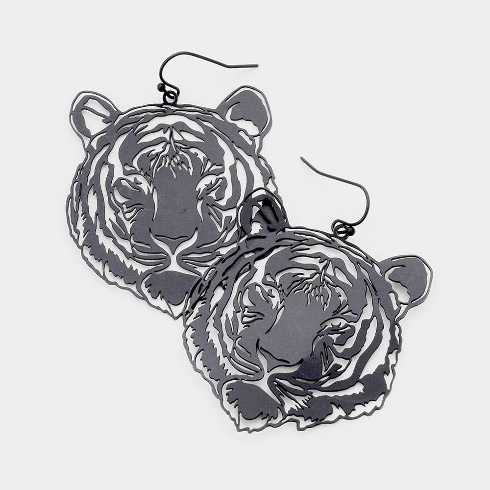 Black Brass Metal Cut Out Tiger Dangle Earrings