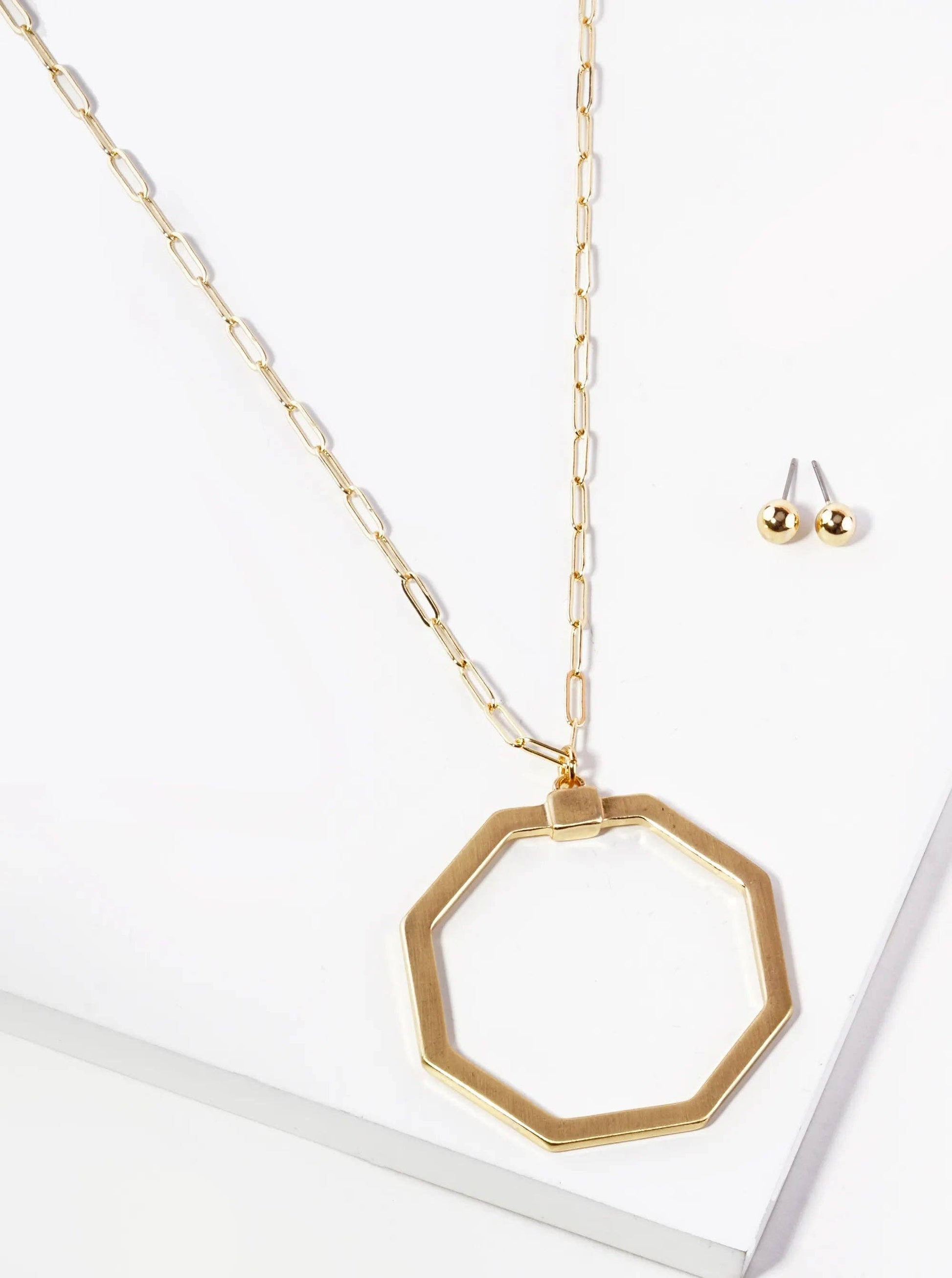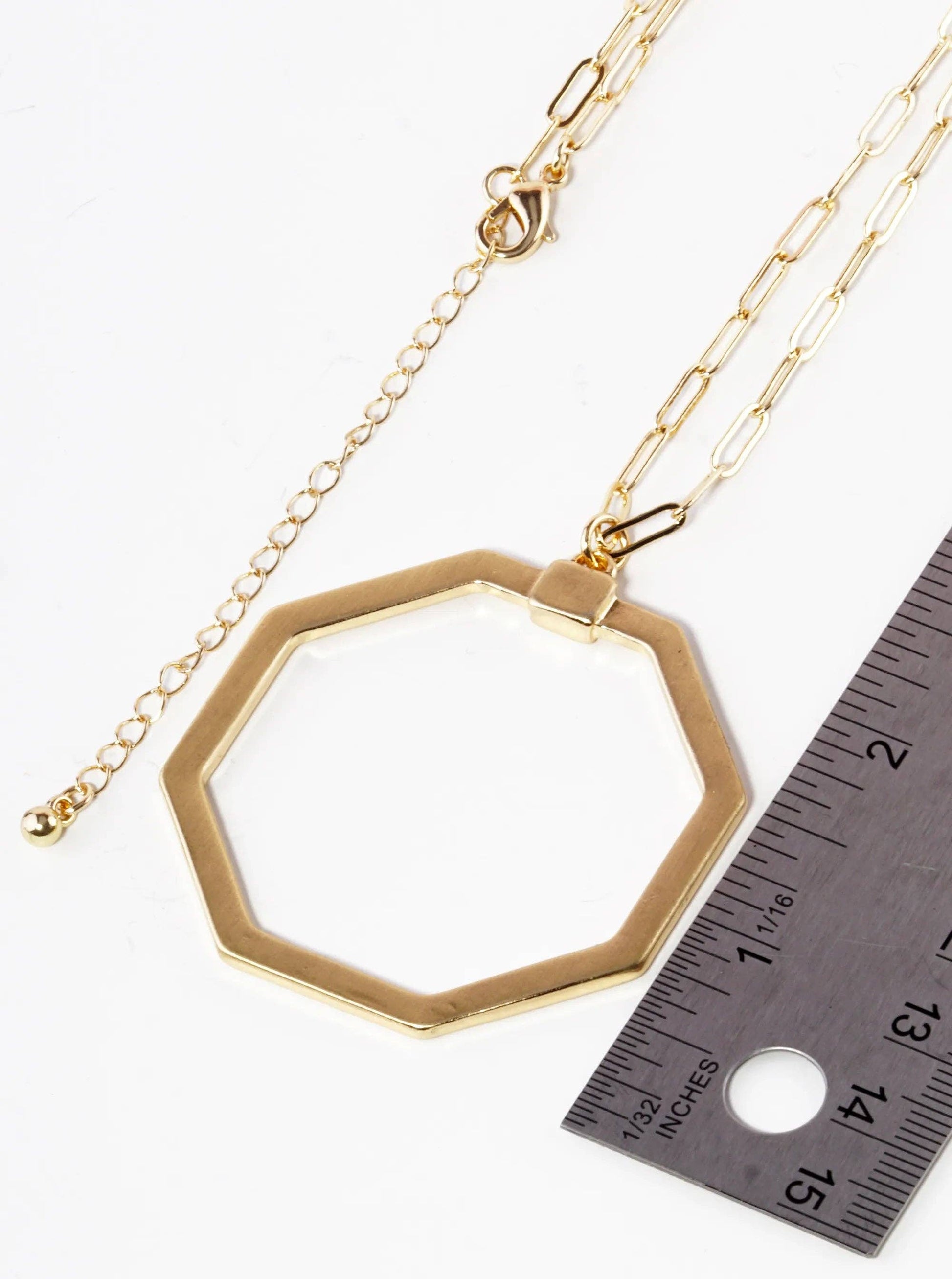 Matte Gold Metal Octagon Pendant 32 Inch Long Necklace