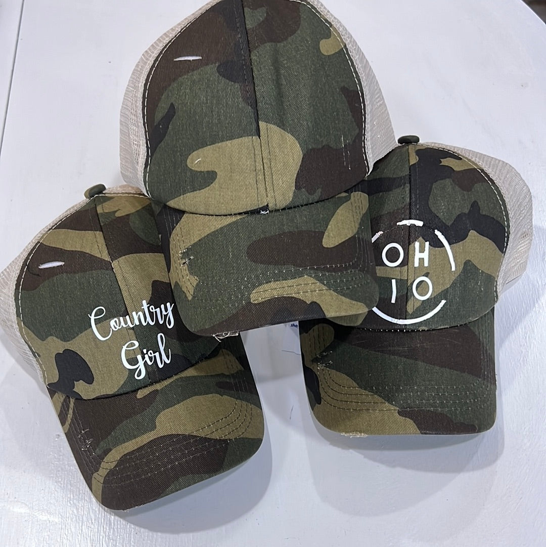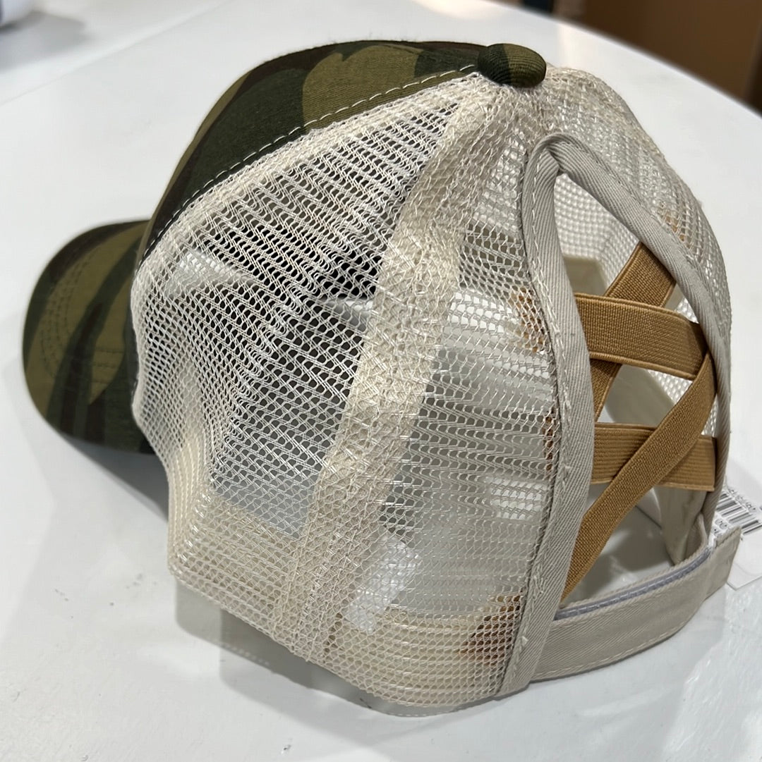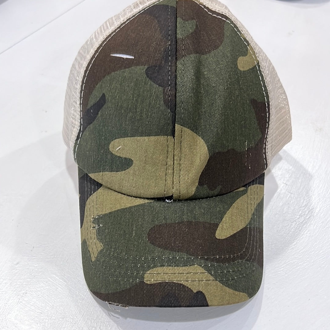 Distressed Camo Trucker's Hat with Elastic Details and Velcro Closure on Back.