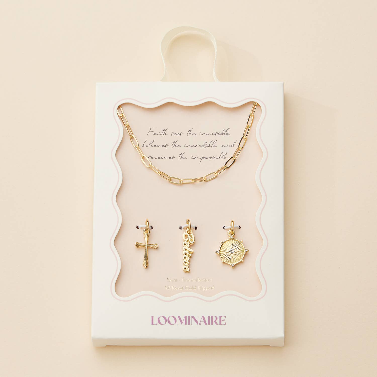 - This necklace features a captivating combination of meaningful charms, including a delicate cross, a radiant compass, and the word "Believe" to serve as a daily reminder of strength and purpose.