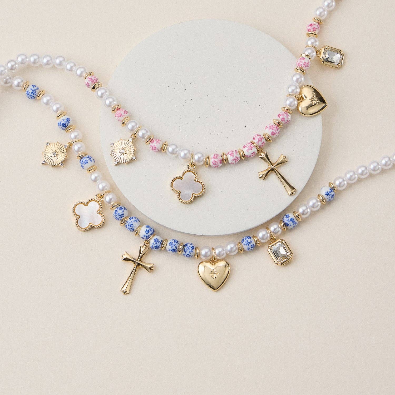 The Faith & Love Pearl Ceramic Mixed Necklace is a meaningful statement piece designed with both beauty and intention. Featuring a blend of glossy faux pearls and floral ceramic beads—available in pink or blue—this necklace is adorned with gold-plated multi-charms that symbolize love, faith, and guidance. Each necklace includes a cross, heart, clover, gem, and sunburst charm, all delicately spaced between the pearl and ceramic bead mix. Adjustable and lightweight, it's a perfect gift or layered addition to any outfit.