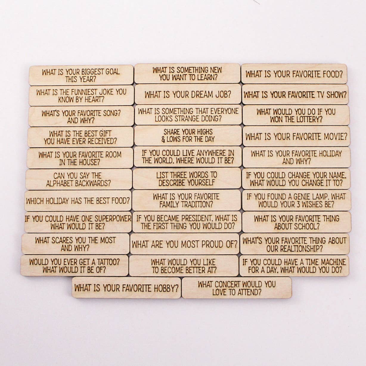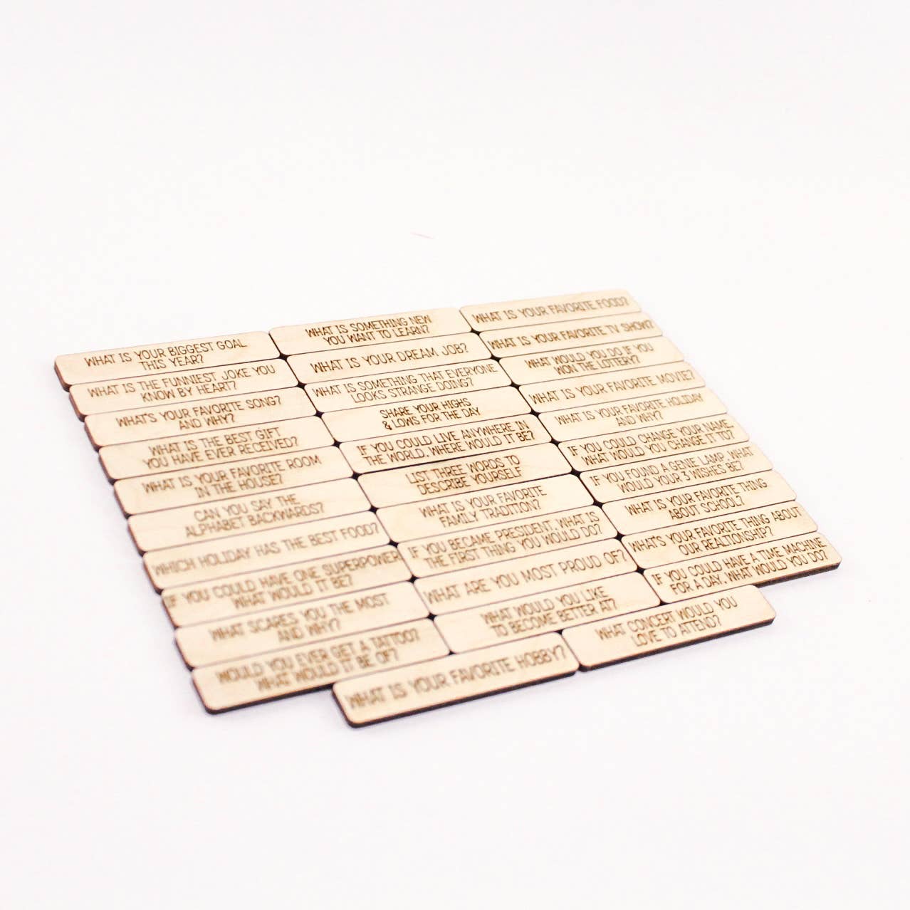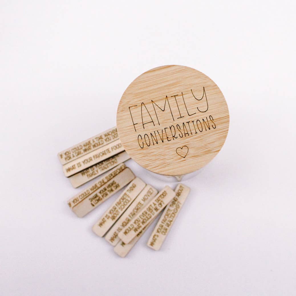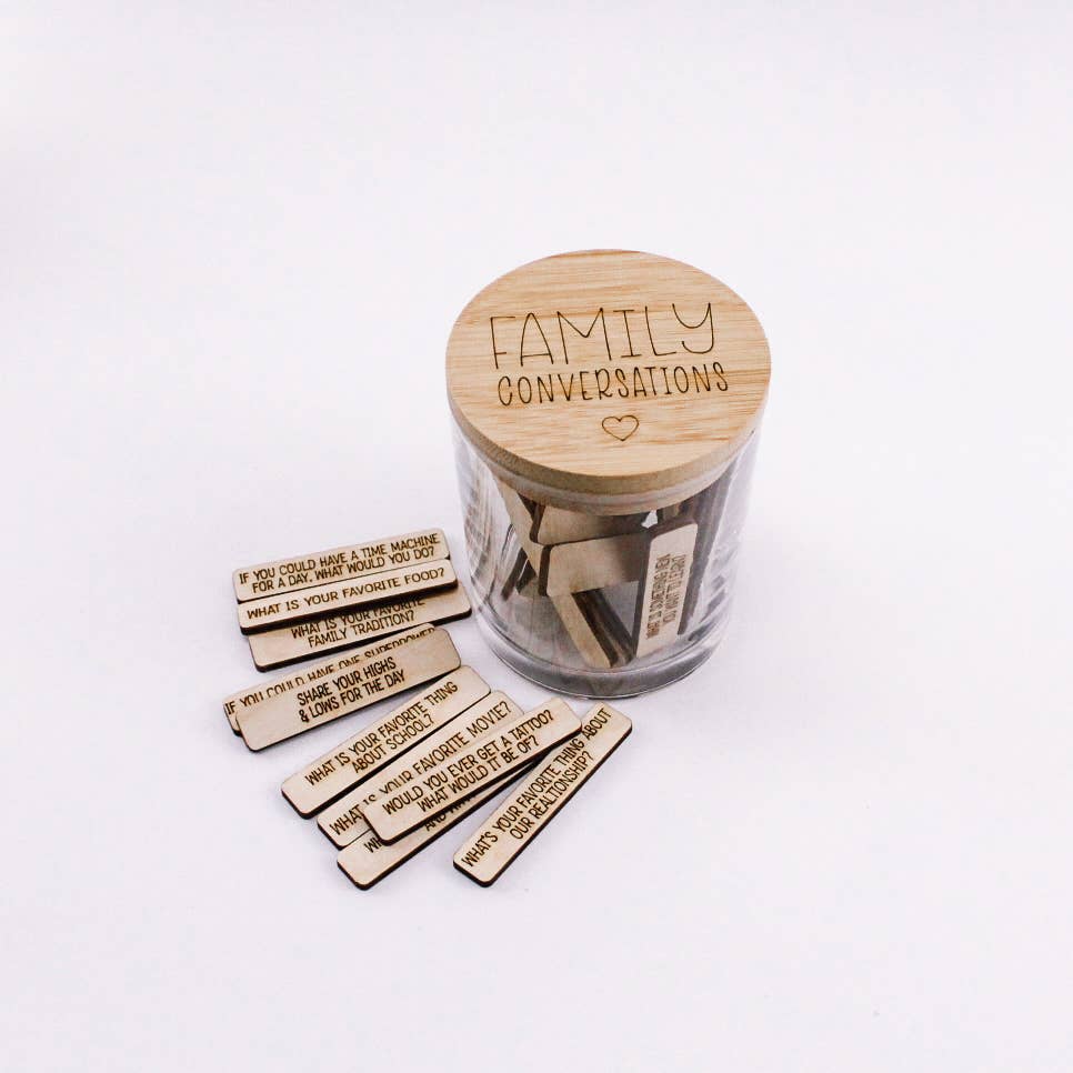 Experience the power of meaningful family conversations with our Family Conversations jar! This glass jar with a Bamboo Lid is engraved with the words "Family Conversations" and comes with 32 conversation starters laser engraved onto wooden tiles. Start sharing and connecting with your loved ones today!
