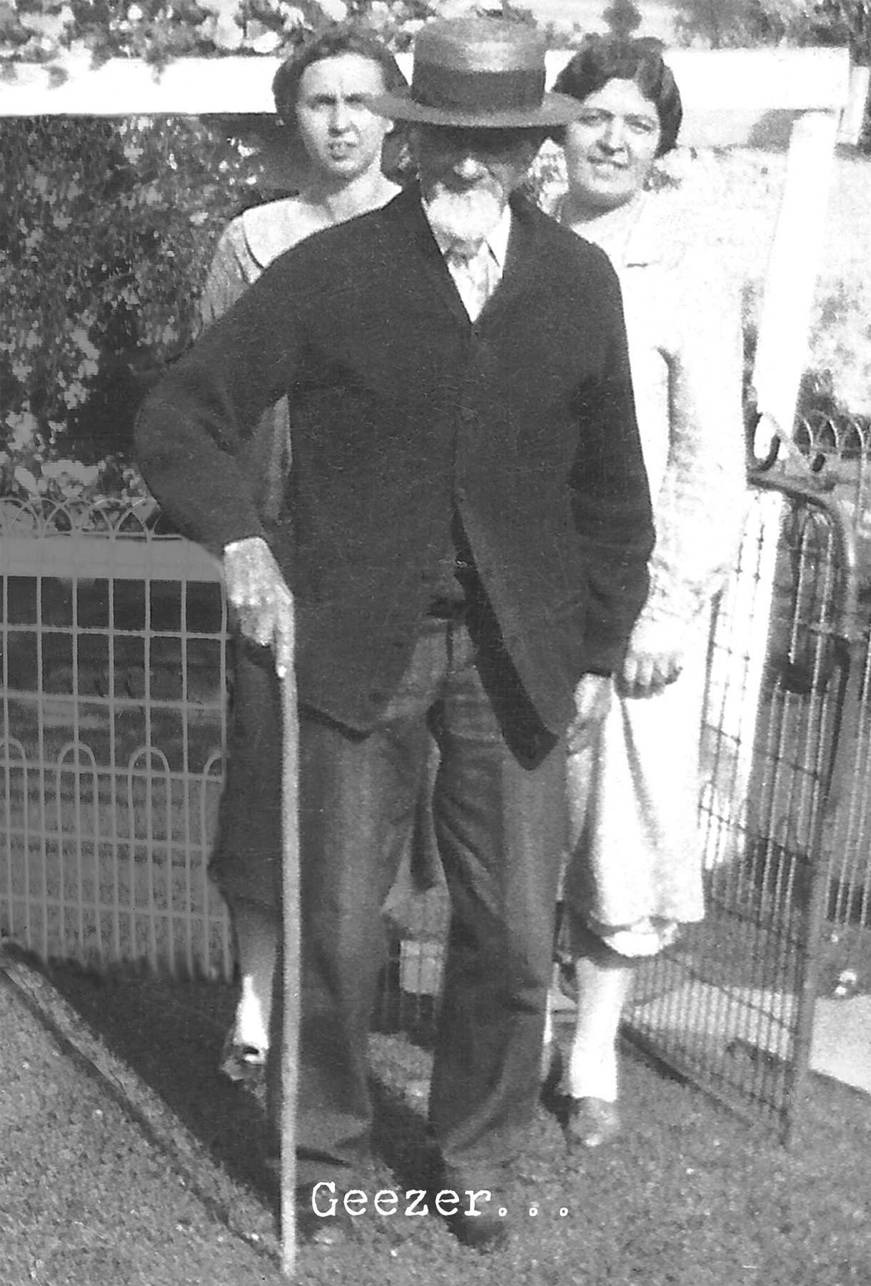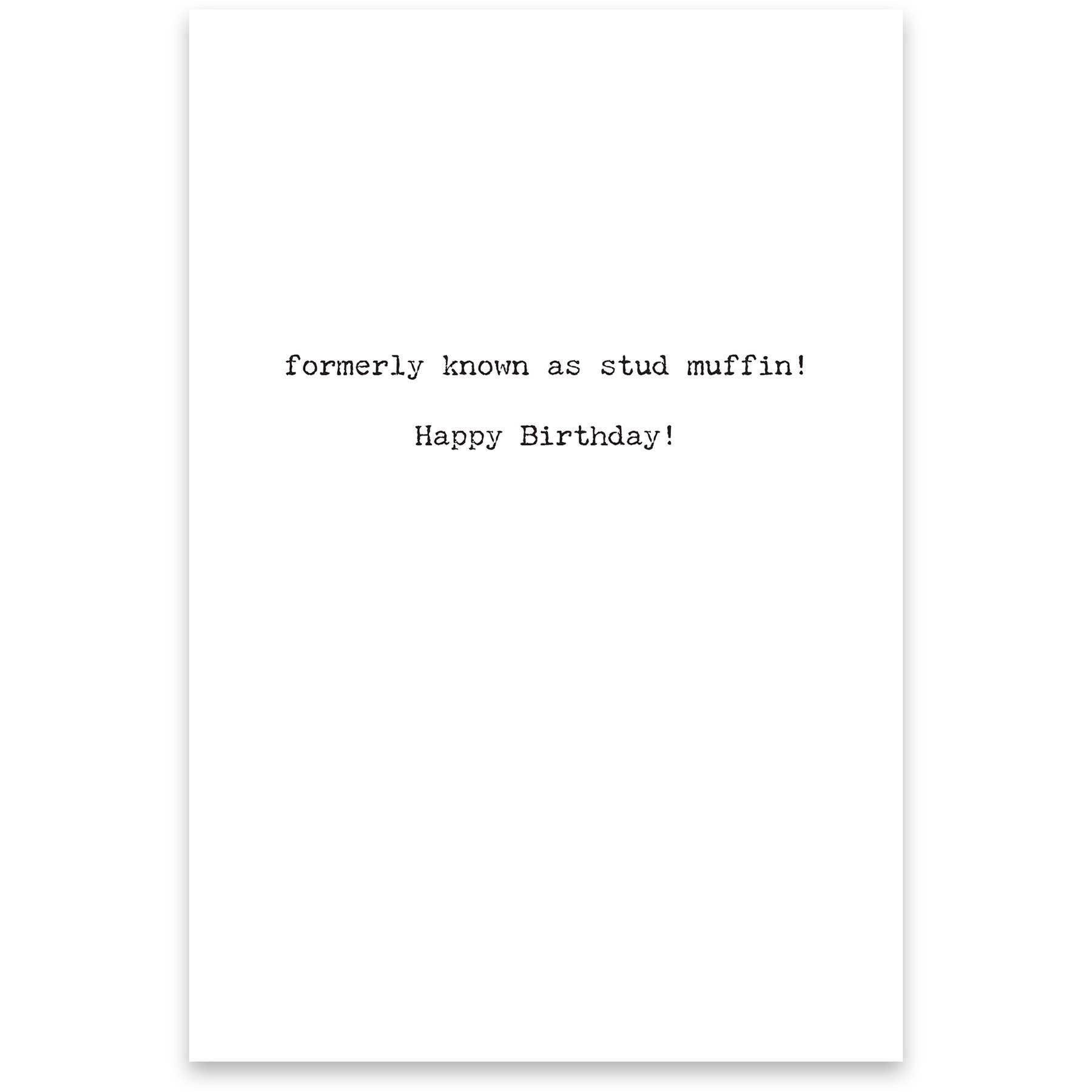 A humorous greeting card lending a vintage photograph to coordinate with its outside "Geezer..." sentiment and inside "Formerly Known As Stud Muffin! Happy Birthday!" sentiment. Made in the USA.