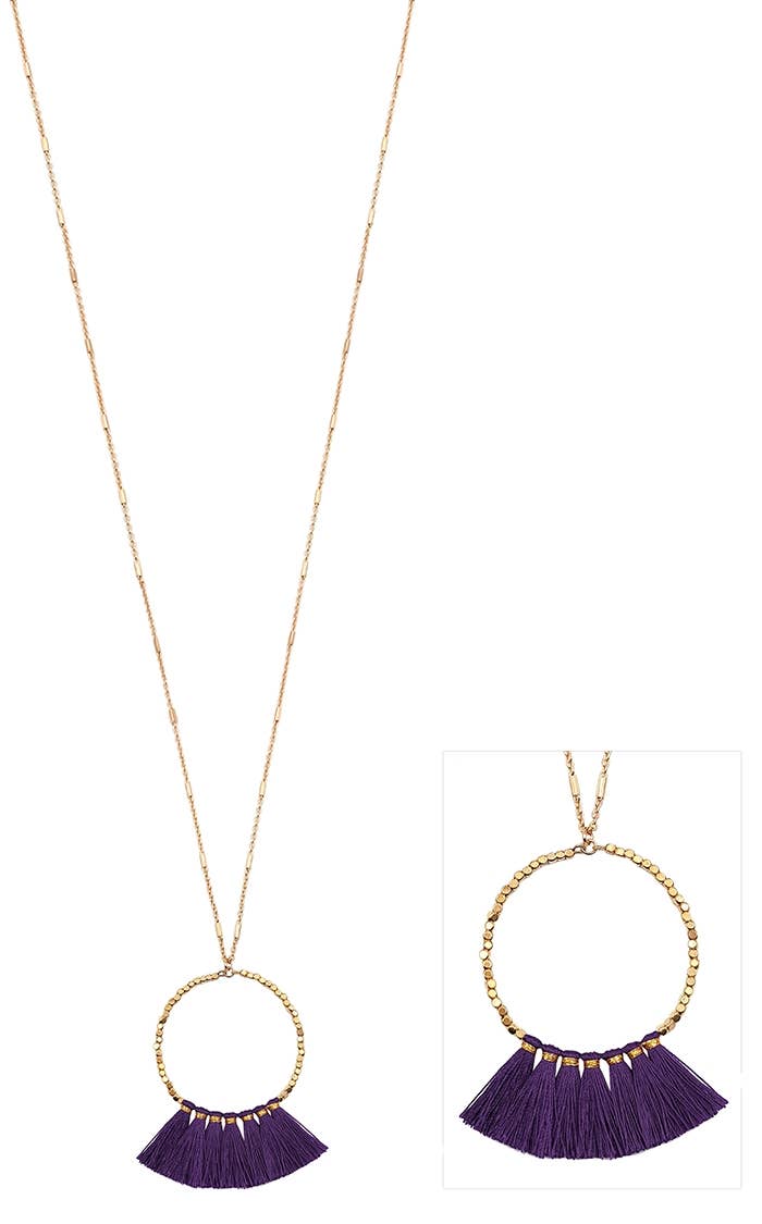 Gold Beaded Hoop With Purple Fabric Tassels 36" Necklace