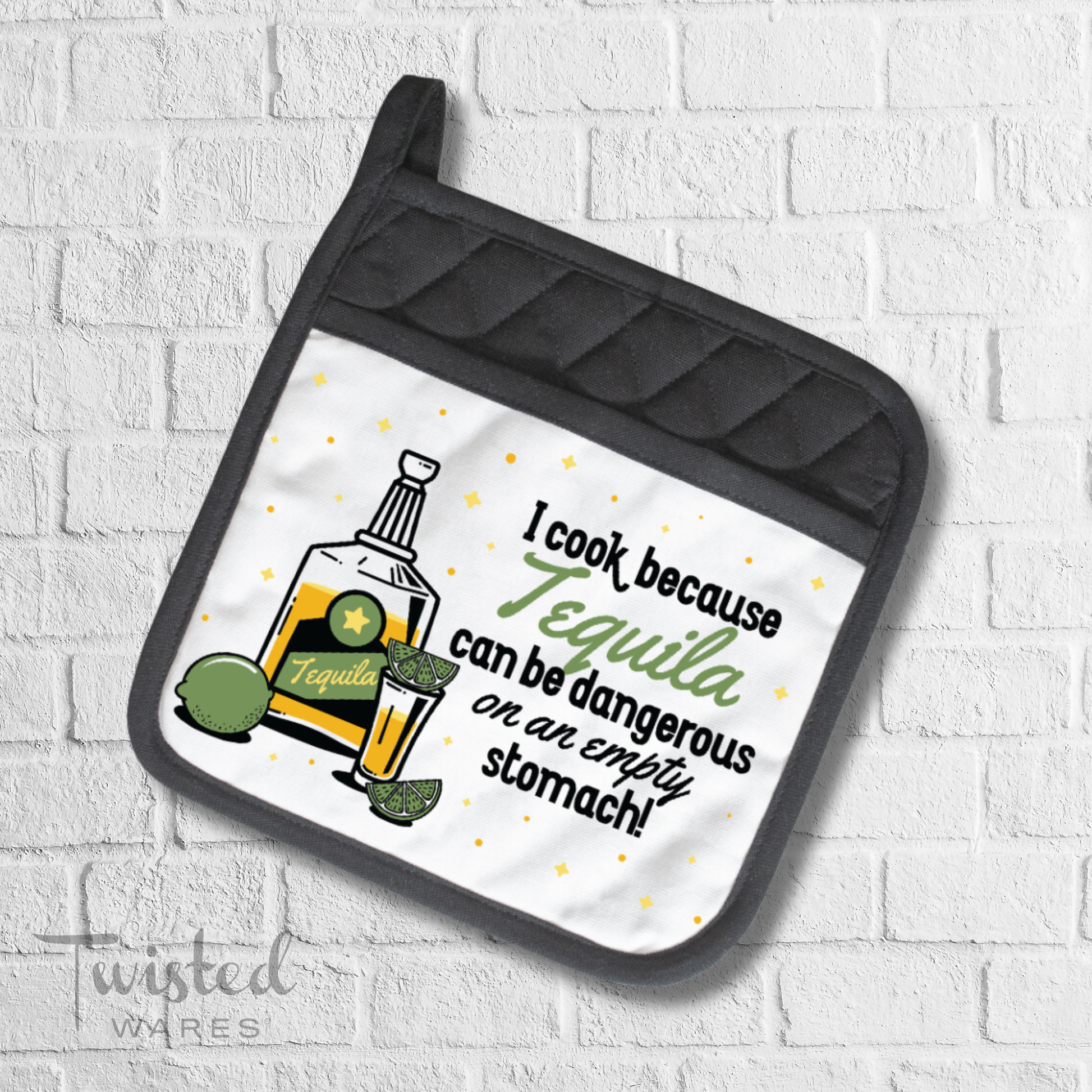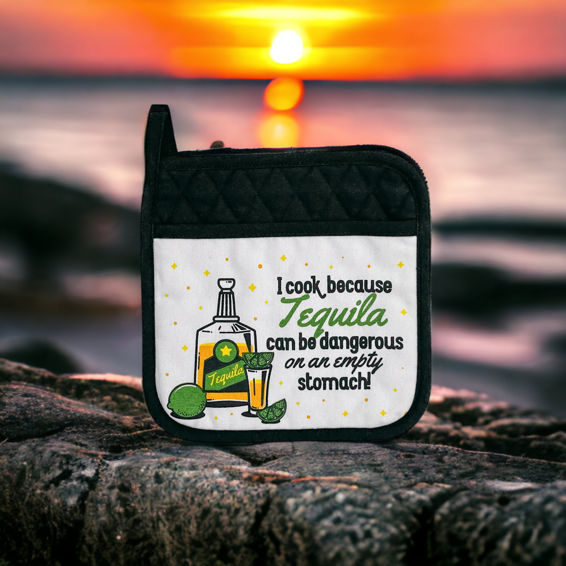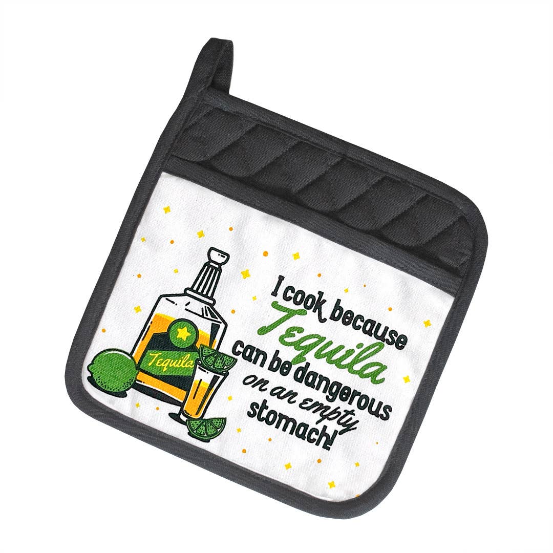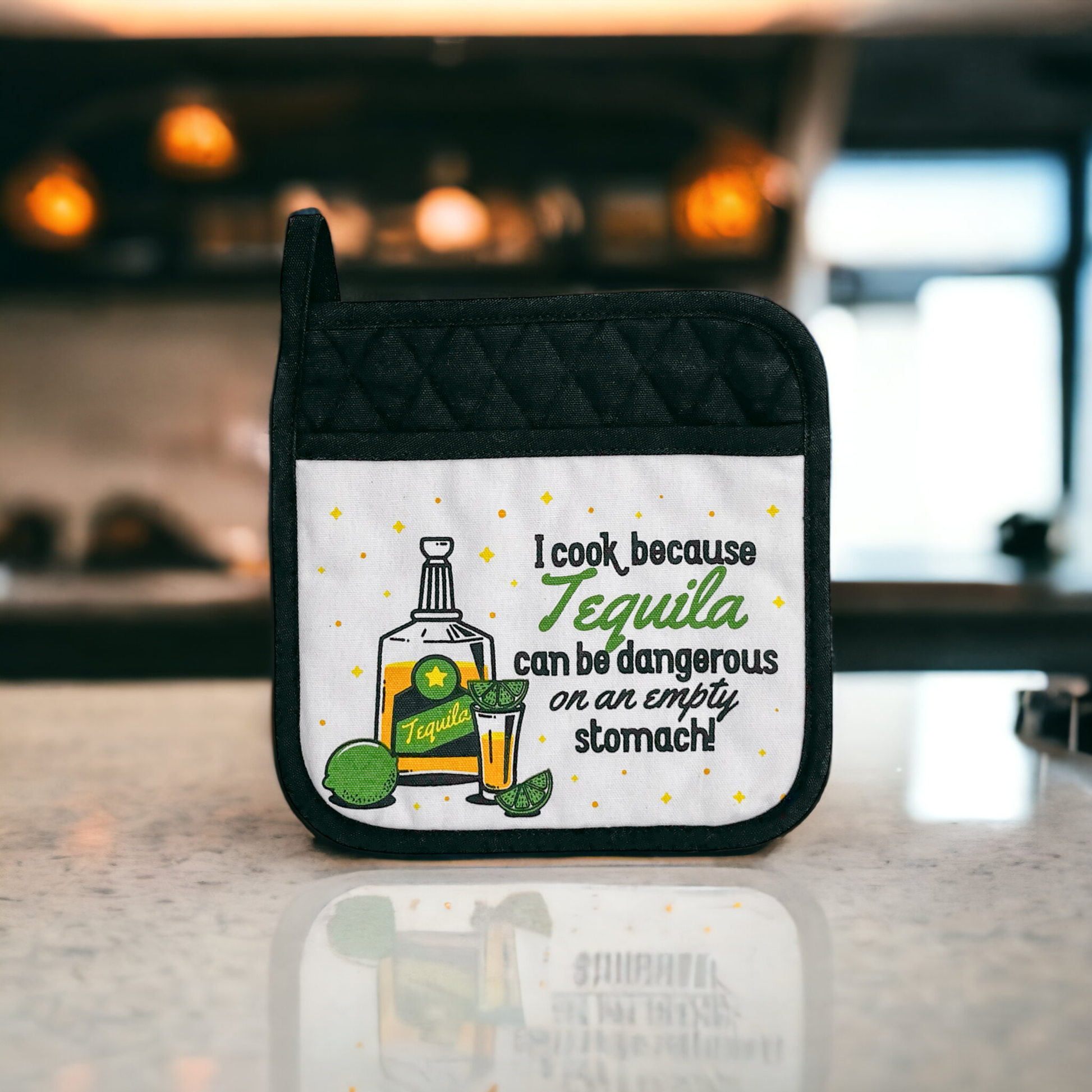 - Spice up your kitchen flair with our “I Cook Because Tequila Can Be Dangerous on an Empty Stomach” Pot Holder! It’s the perfect mix of humor and functionality for anyone who knows that tequila tastes better after some tacos.