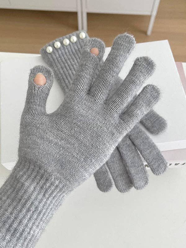 - Comfy Knit Gloves with pearl accents along the wrist.