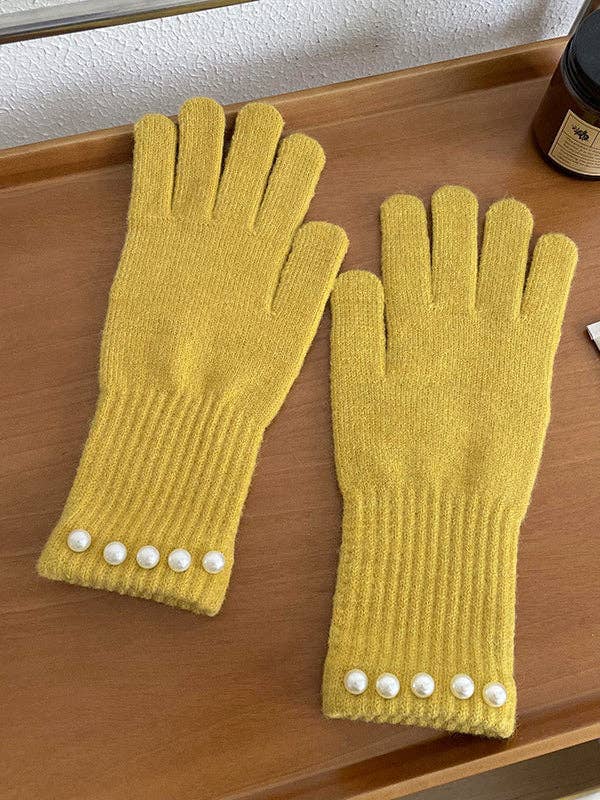 - Comfy Knit Gloves with pearl accents along the wrist.