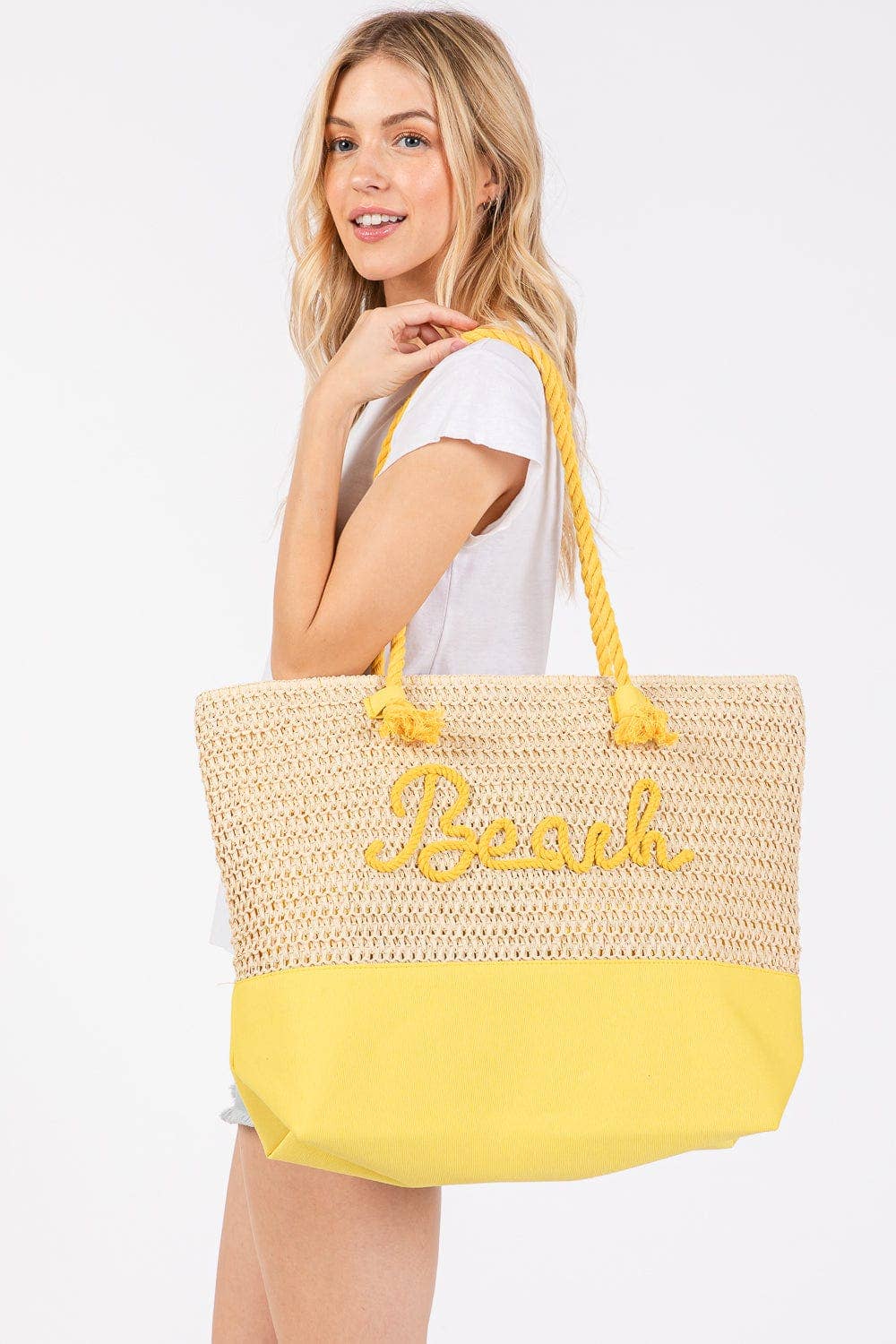 Yellow Sewn Rope Beach Letter Color Straw Tote Bag