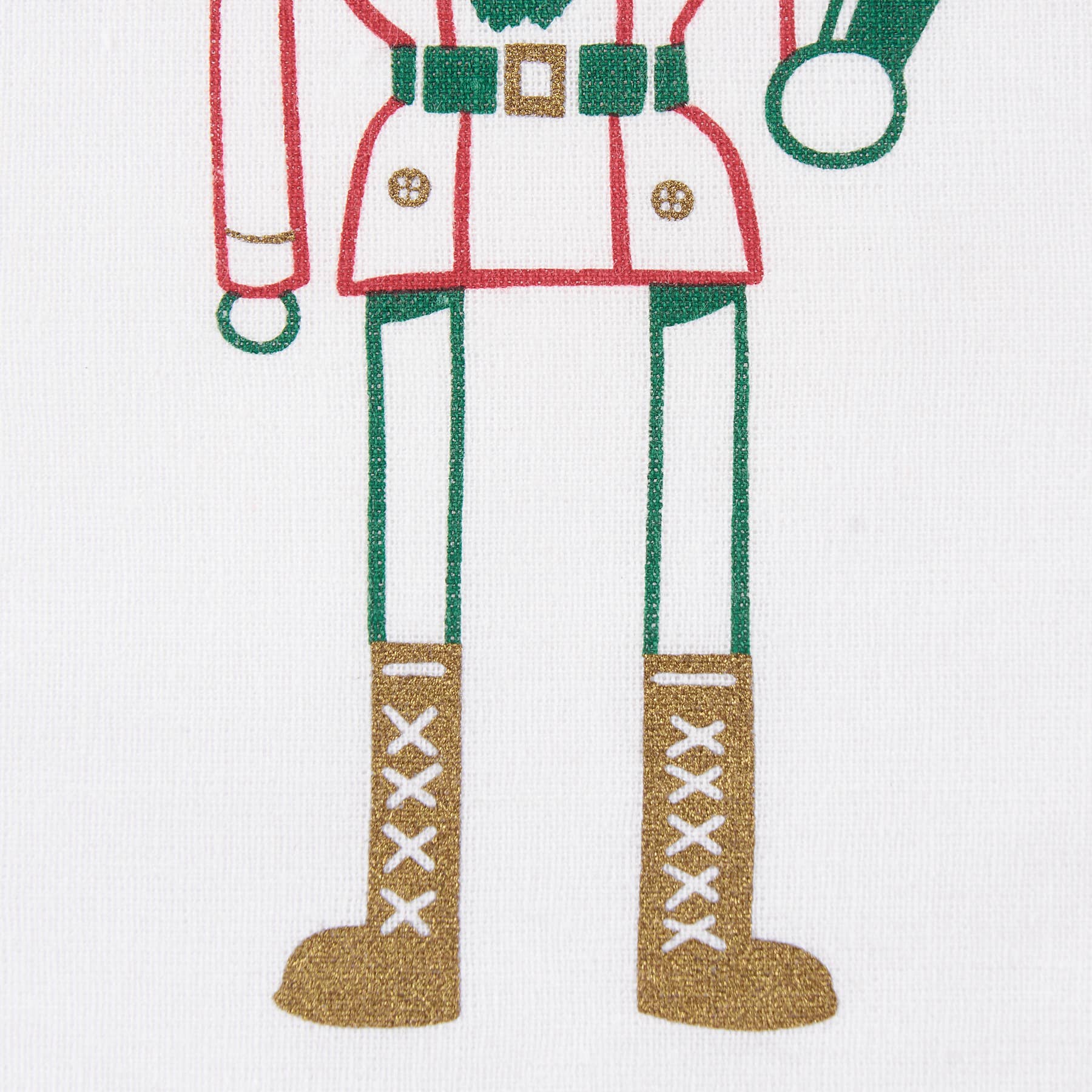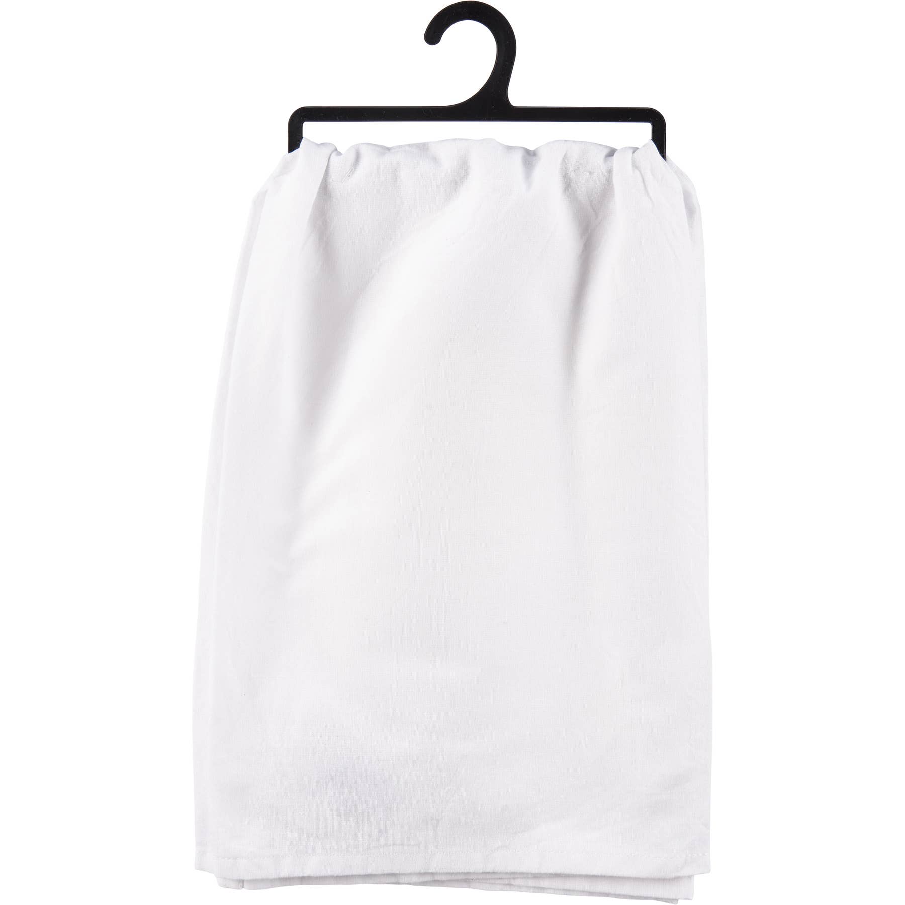 A white cotton kitchen towel from our Christmas Collection displaying a unique hand illustrated design of a nutcracker holding a TV remote. Design features red and green color palette with metallic gold accents and humorous sentiment that reads "Unless You Want Your Nuts Cracked... You Better Let Me Finish My Christmas Movie!" Our Nuts Cracked kitchen towel is machine-washable for convenient cleaning. Packaged on a black plastic hanger to easily display on rack. A fun and functional seasonal kitchen accent.