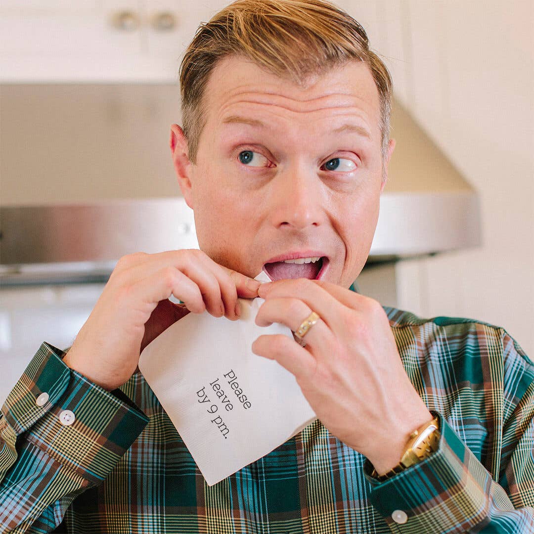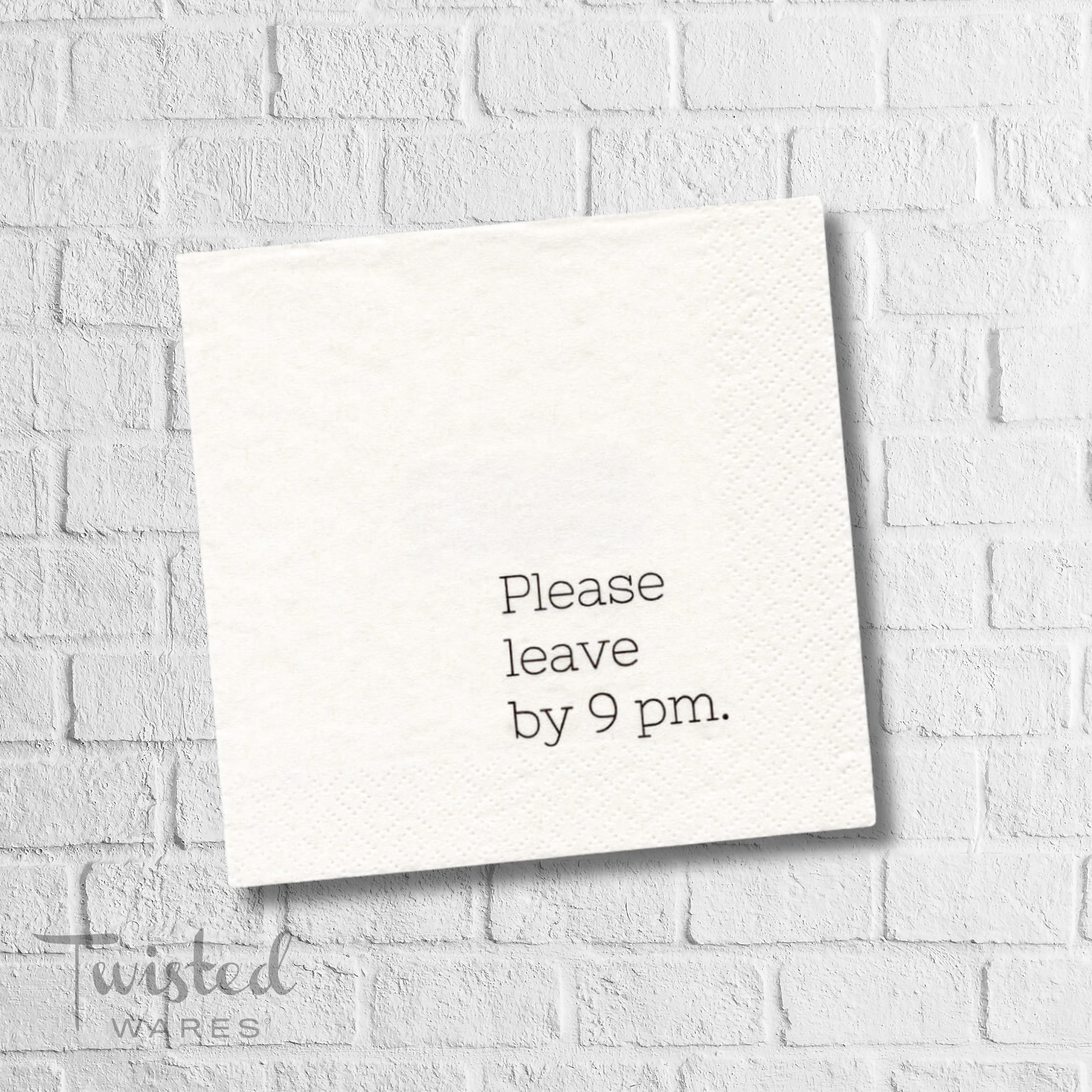 - Our 'Please Leave By 9 PM Napkins' are the laugh-out-loud addition to your event that politely tells your guests it's time to hit the road.