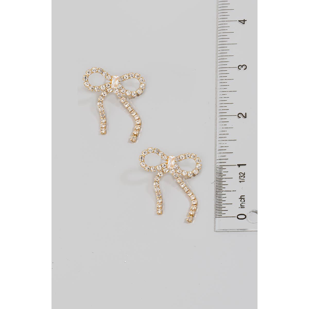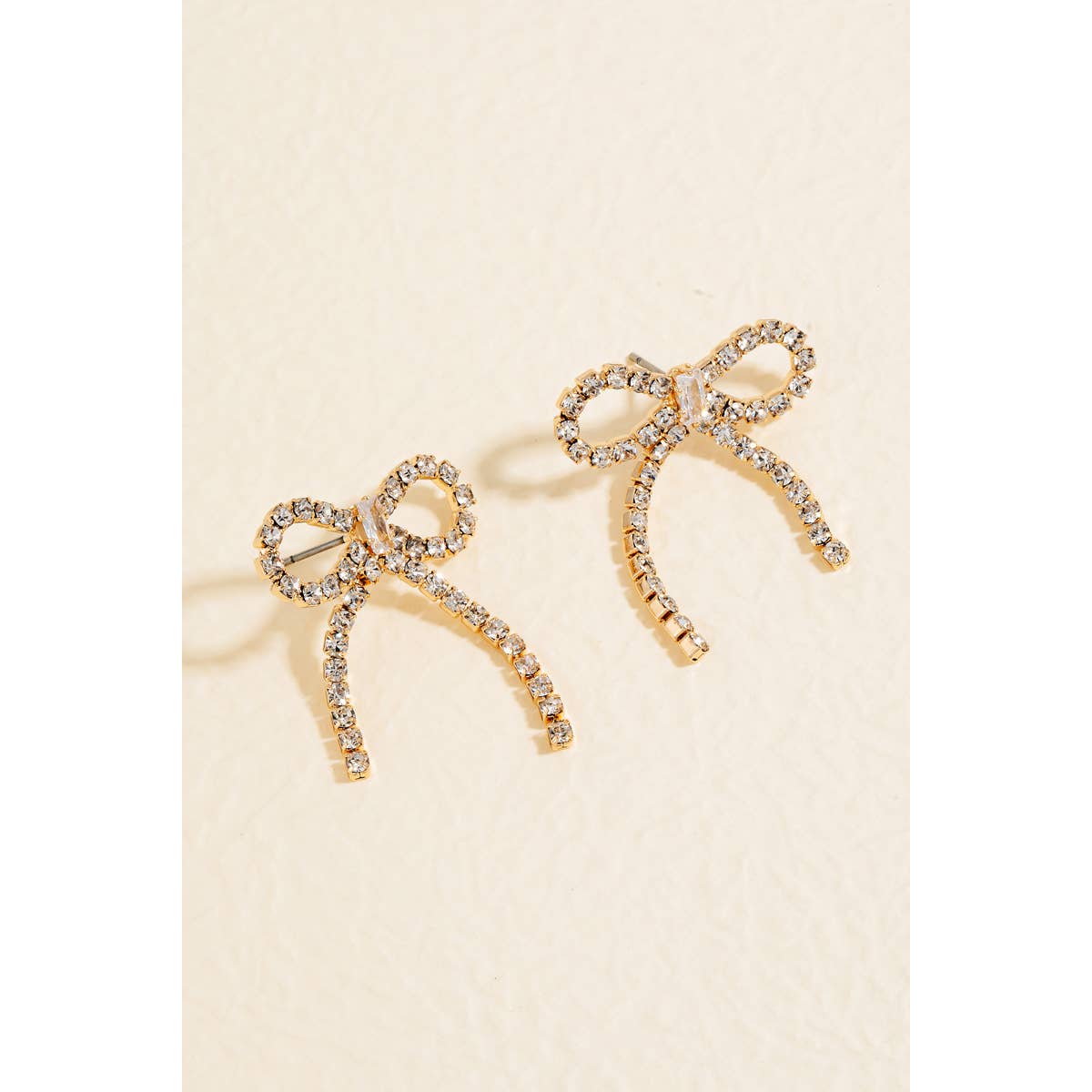This pair of stud earrings adds a modern rhinestone studded ribbon bow style. Elevate your ensemble with this accessory that effortlessly captures the essence of refined fashion.