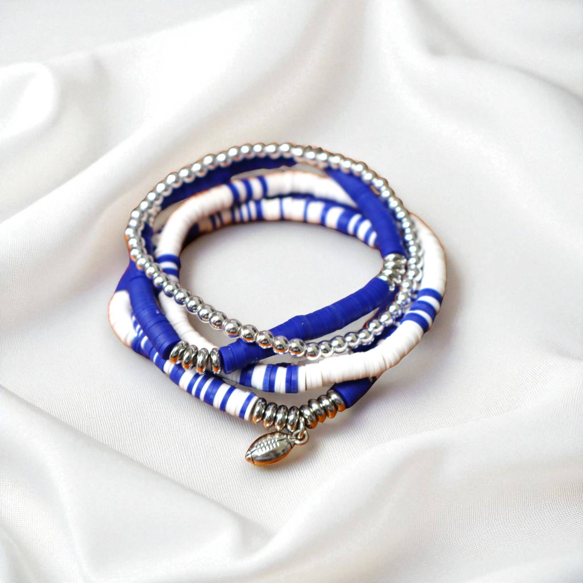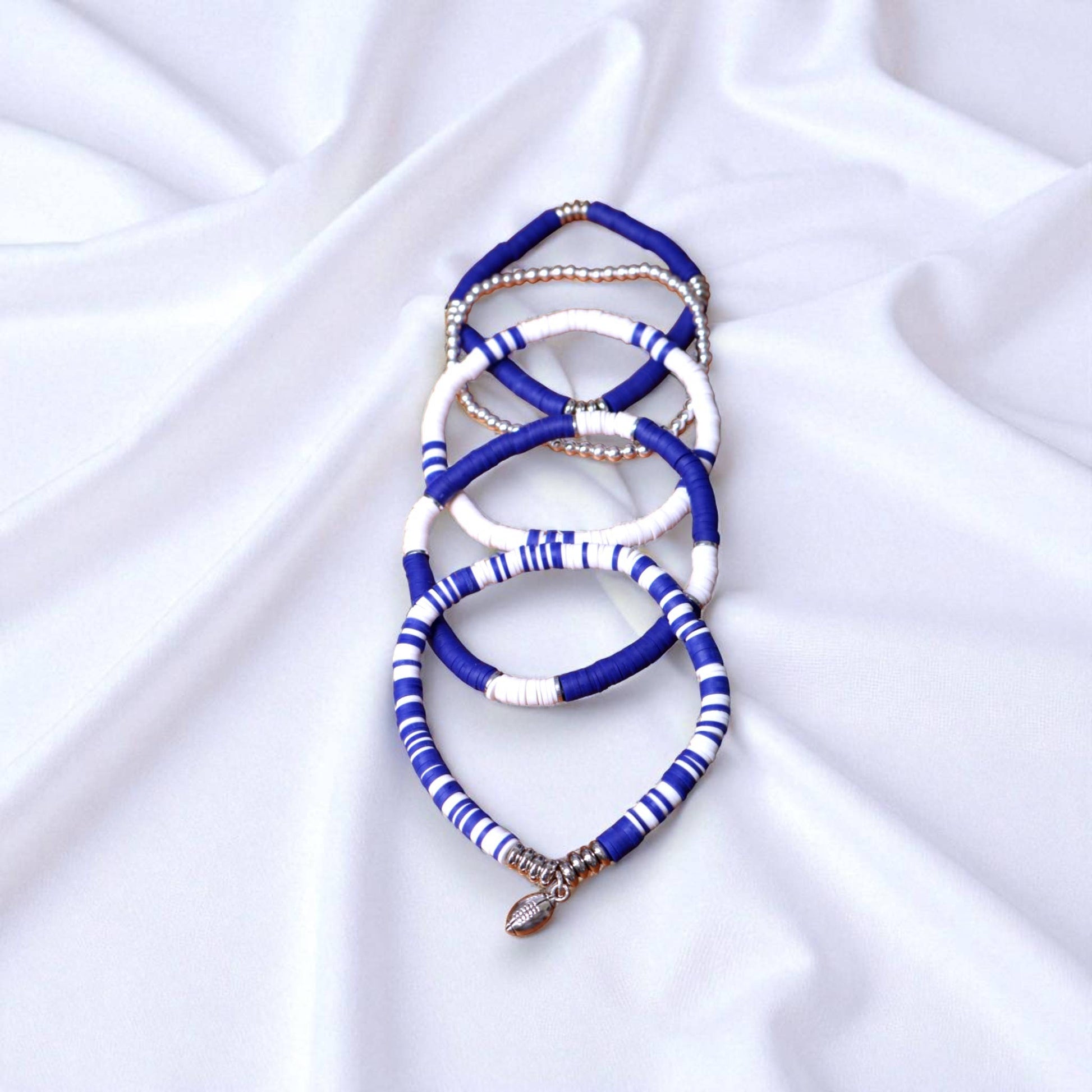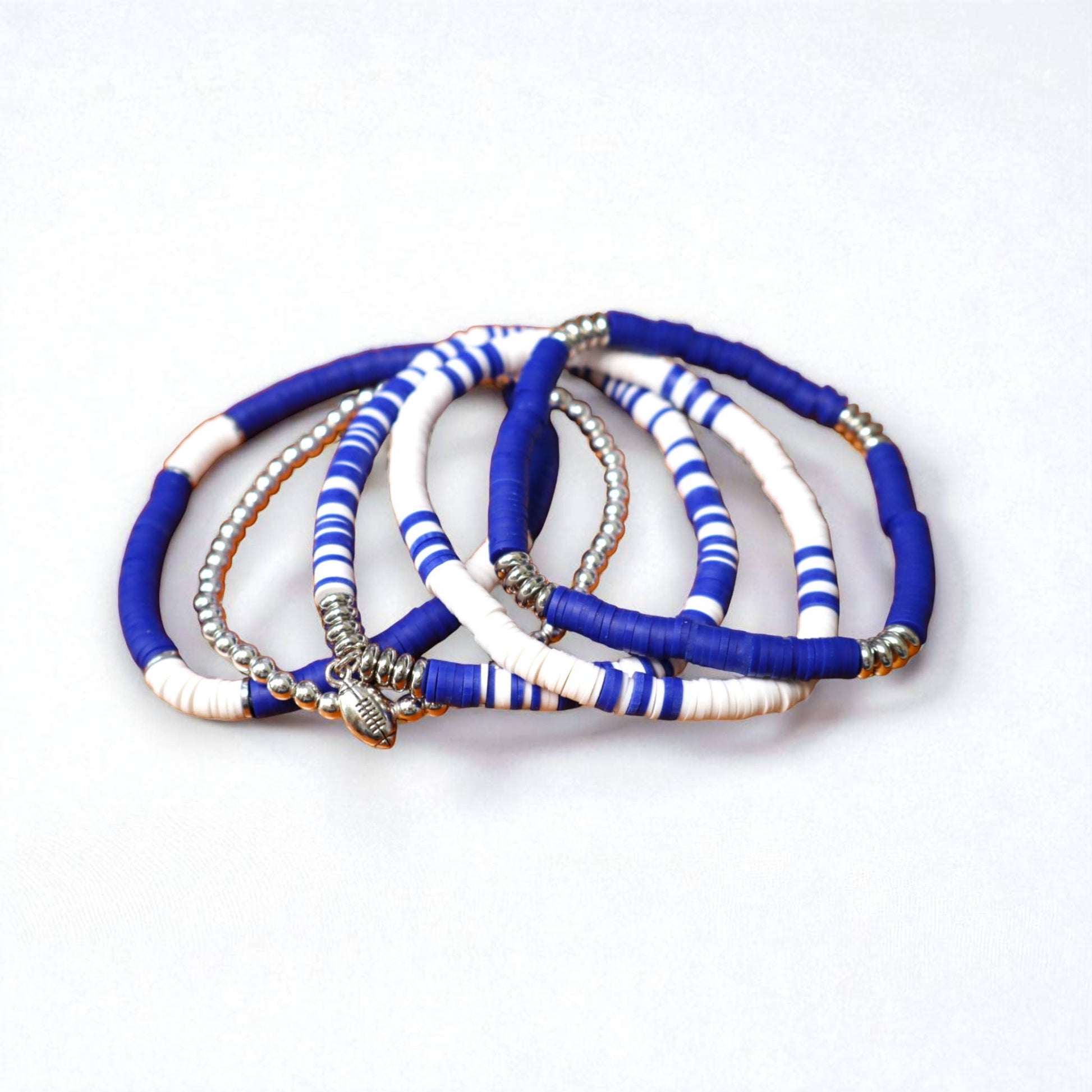 Show off your team spirit in style with this bold royal blue and white game day bracelet stack. Featuring vibrant heishi polymer clay beads, shimmering silver accent beads, and a sport or mascot charm of your choice, this stack is the perfect accessory for cheering on your favorite team. Each bracelet is lightweight, flexible, and comfortable enough for all-day wear, whether you’re tailgating, sitting in the stands, or celebrating a big win. The stack includes a mix of solid and striped bead designs to add texture and visual interest, making it easy to pair with any game day outfit.