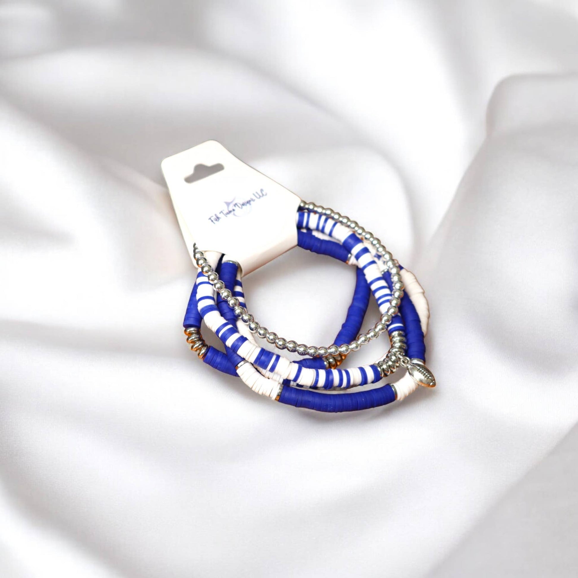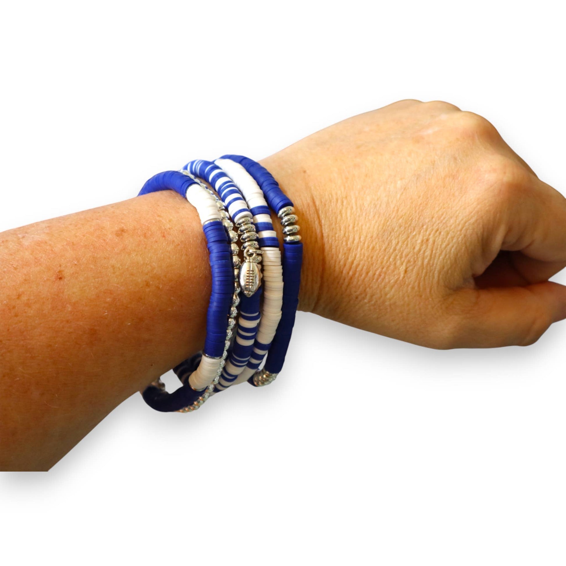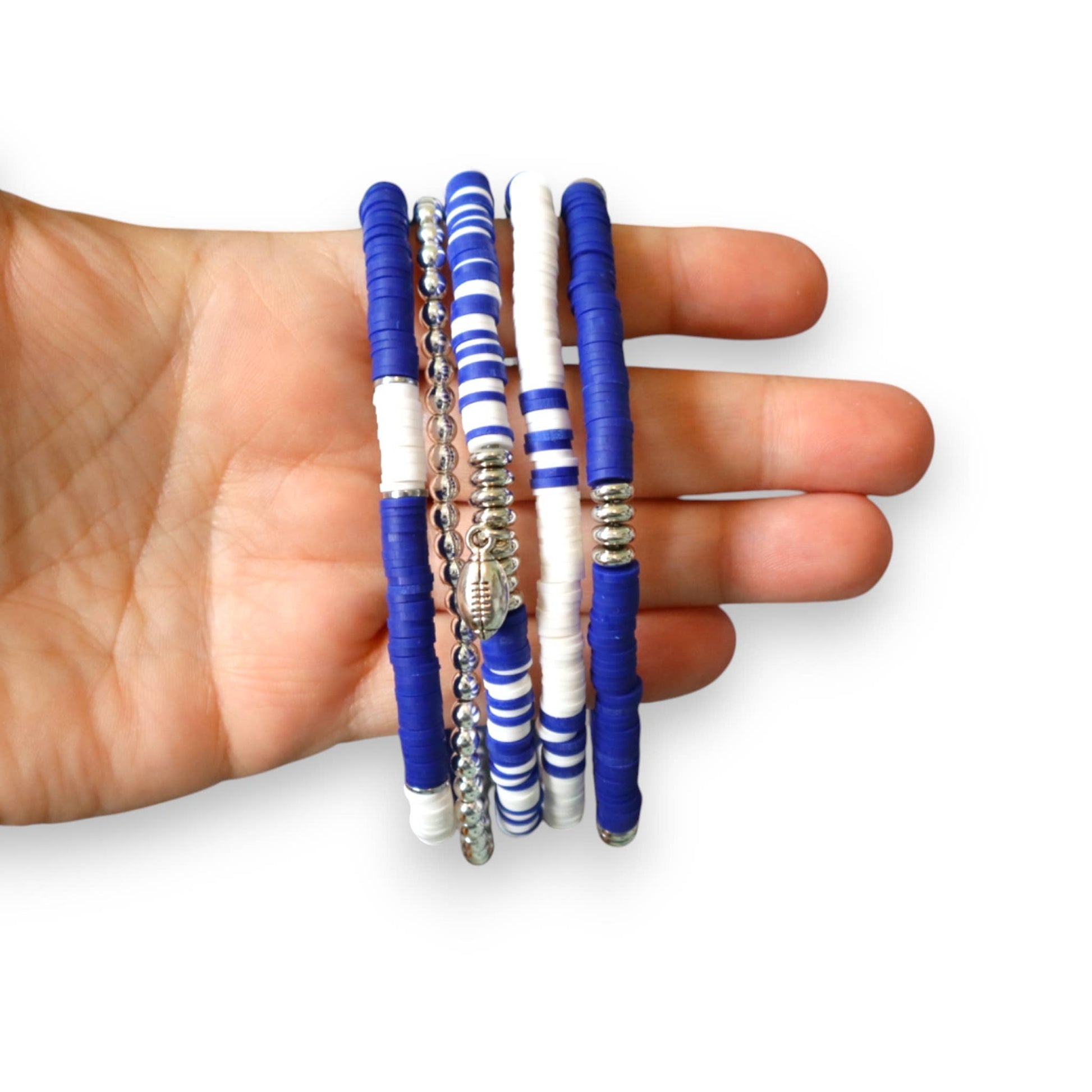 Show off your team spirit in style with this bold royal blue and white game day bracelet stack. Featuring vibrant heishi polymer clay beads, shimmering silver accent beads, and a sport or mascot charm of your choice, this stack is the perfect accessory for cheering on your favorite team. Each bracelet is lightweight, flexible, and comfortable enough for all-day wear, whether you’re tailgating, sitting in the stands, or celebrating a big win. The stack includes a mix of solid and striped bead designs to add texture and visual interest, making it easy to pair with any game day outfit.
