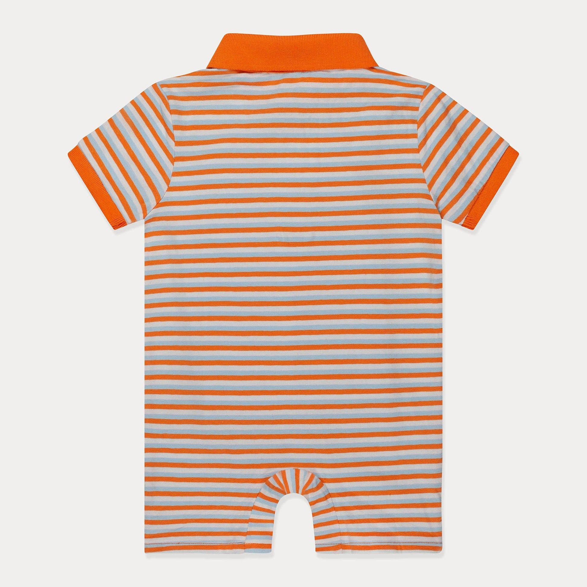 Keep your little one cool and stylish with our Jersey Cotton Baby Shortall in Orange Stripes. Soft and Breathable: Our baby boy summer romper is made from jersey cotton, ensuring your baby stays comfortable and cool. · Fun Orange Stripes: The vibrant orange stripes add a cheerful touch to your baby's wardrobe. · Easy Dressing: This short sleeve romper baby boy features convenient snaps for quick and hassle-free dressing and diaper changes. · Perfect Fit: Available in multiple sizes, our baby boy shortalls offer a great fit and comfort for your little one. · Summer Essential: Ideal for warm weather, this romper combines style and practicality, making it a must-have for any baby boy’s summer adventures.