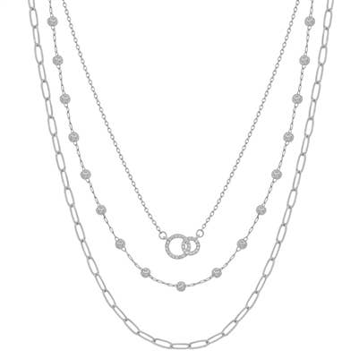 Silver Triple Layered Chain and Rhinestone Circle Necklace