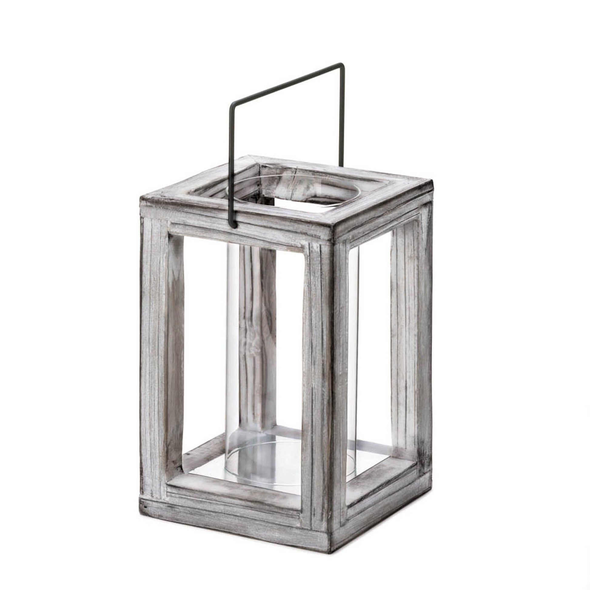 - The rectangular wood base holds a tall, clear glass cylinder that will protect the candle of your choice from the wind.