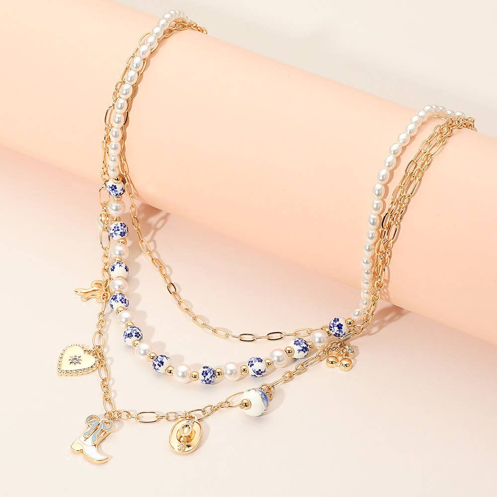 - Elegant layered necklace featuring gold chains, pearl accents, and blue beads with assorted charms. A playful yet chic accessory perfect for adding a whimsical twist to casual or dressed-up outfits.